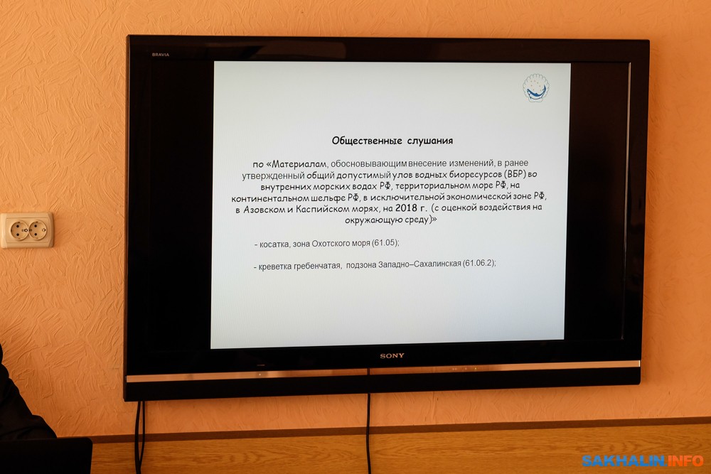 Заказчиком общественных слушаний, которые, скорее, выглядели, как круглый стол с профильными специалистами (из простых людей на встрече не было никого), выступило Росрыболовство. СахНИРО предоставил площадку для обсуждений, а его специалисты озвучили материалы прогнозов, которые все это время находились в свободном доступе в библиотеке научного учреждения. На повестке стояло два вопроса — общие квоты добычи на 2019 год и корректировка по некоторым видам морских обитателей на 2018-й.