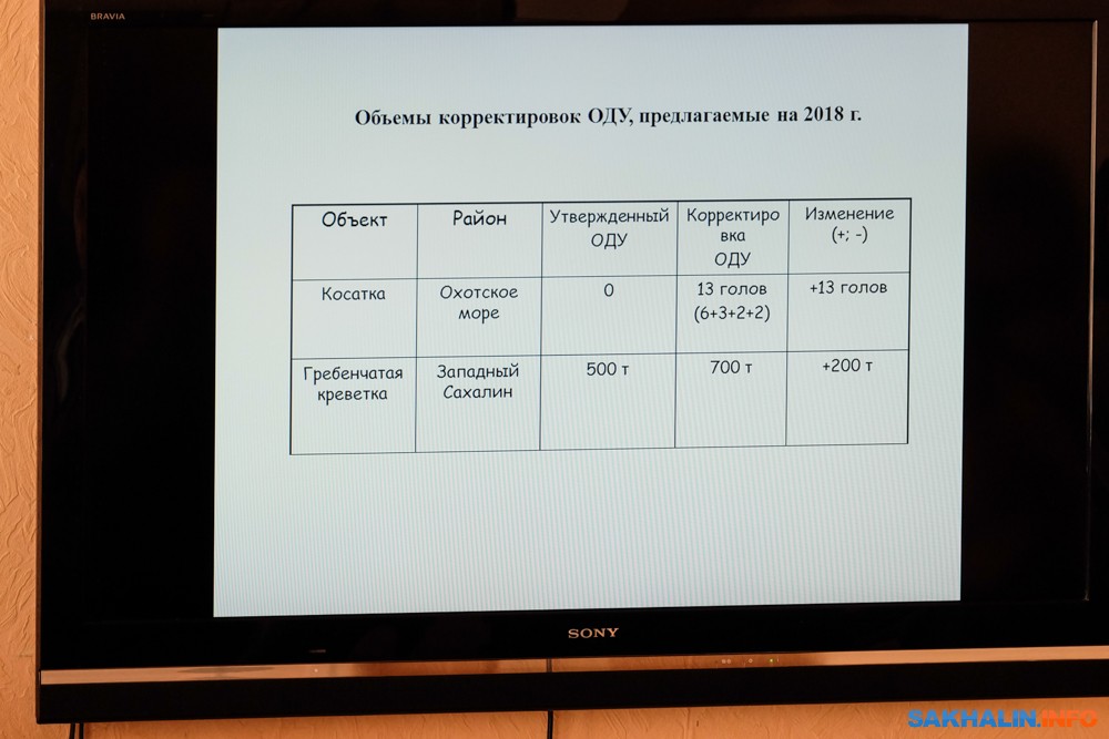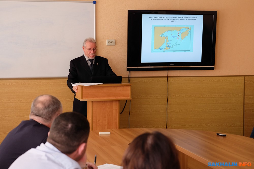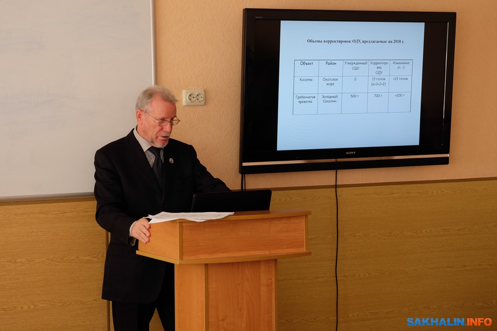 С подробными докладами выступал советник директора СахНИРО Анатолий Великанов. Спикер поделился с коллегами информацией и материалами, на основании которых вносятся изменения в ранее утвержденные общедопустимые островные уловы. Великанов отметил, что корректировки на этот год коснутся двух видов водно-биологических ресурсов: косаток и гребенчатой креветки. По информации ученых, морских млекопитающих без ущерба для популяции в Охотском море можно выловить в объеме 13 голов, а беспозвоночных у берегов Сахалина и Курил на 200 тон больше, чем планировалось: 700 вместо прежних 500.