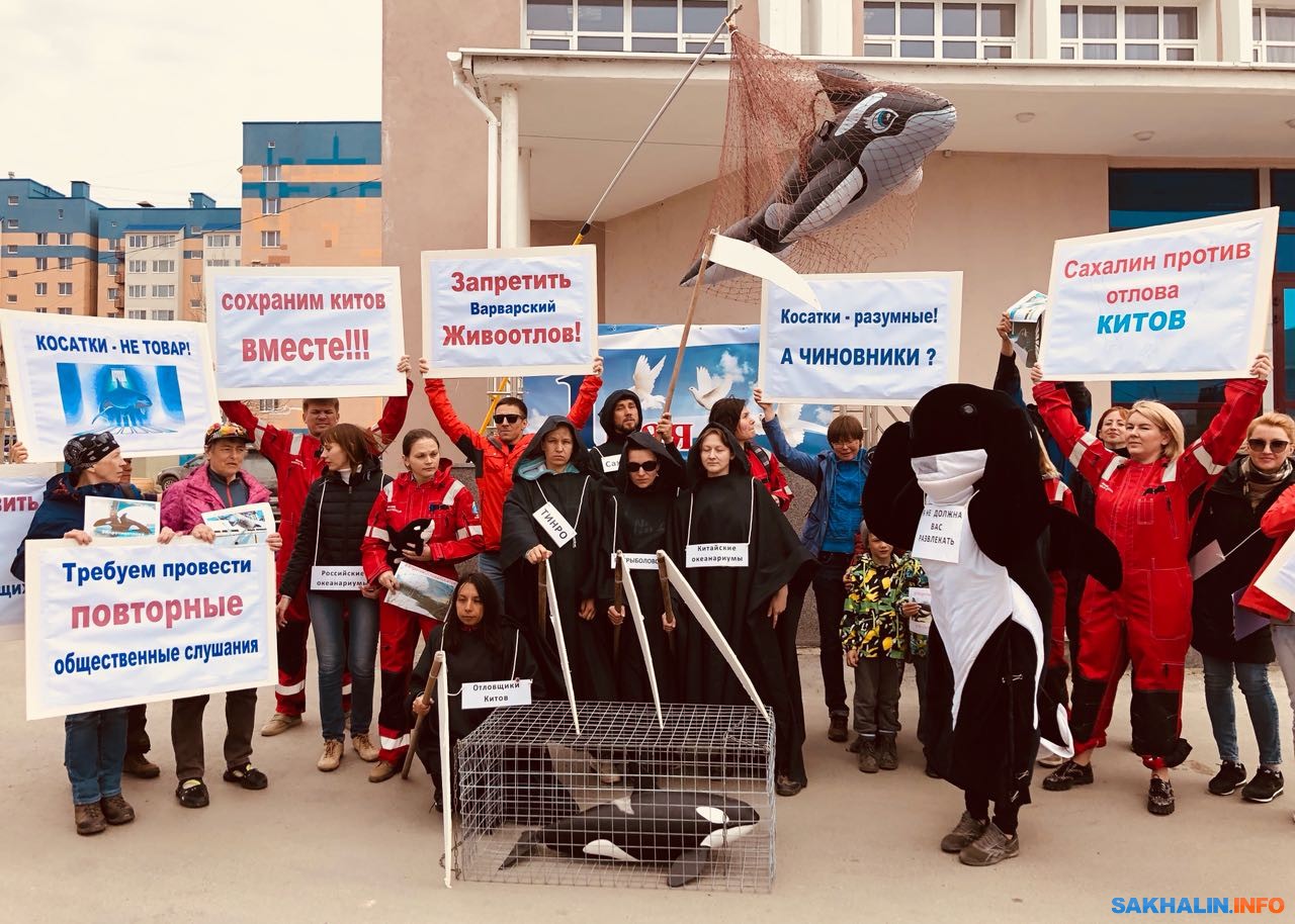 Среди основных требований пикетчиков — остановить выдачу квот на отлов морских млекопитающих, повторно собрать общественные слушания, а также провести реальное исследование численности косаток в Охотском море.