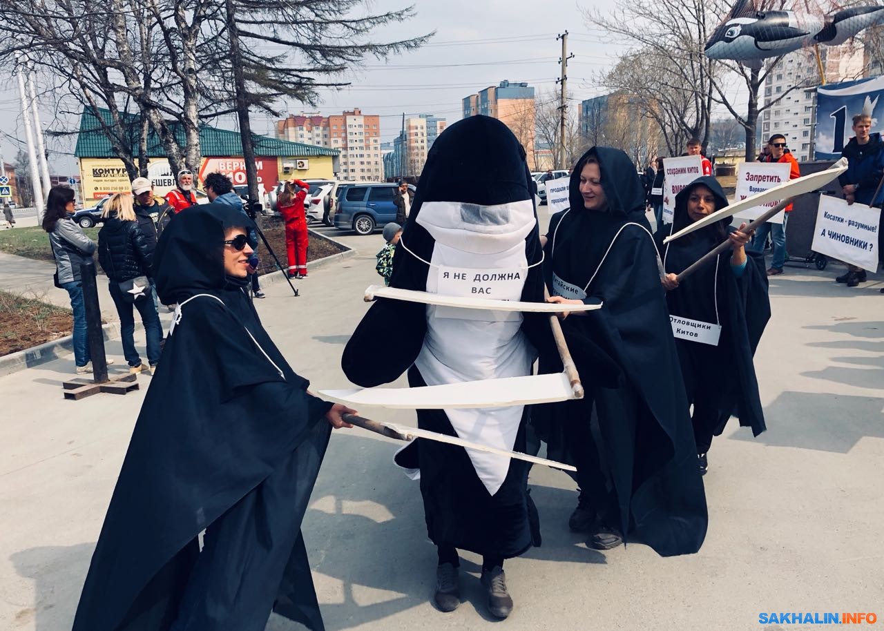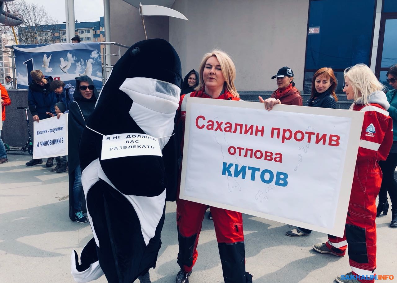 Площадка перед "Родиной" пестрила не только плакатами, бережно нарисованными активистами ("Косатки не товар", "Сахалин против отлова китов", "Сохраним китов вместе", "Запретить варварский живоотлов", "Продали весь лосось, продадим всех косаток"), но и небольшим интерактивом: между активистами и горожанами, ходила двуногая косатка с неозвученной, но написанной с помощью нагрудной таблички фразой: "Я не должна вас развлекать!" Так выглядела попытка сахалинских любителей природы повлиять на выделение дополнительных квот для вылова морских млекопитающих.