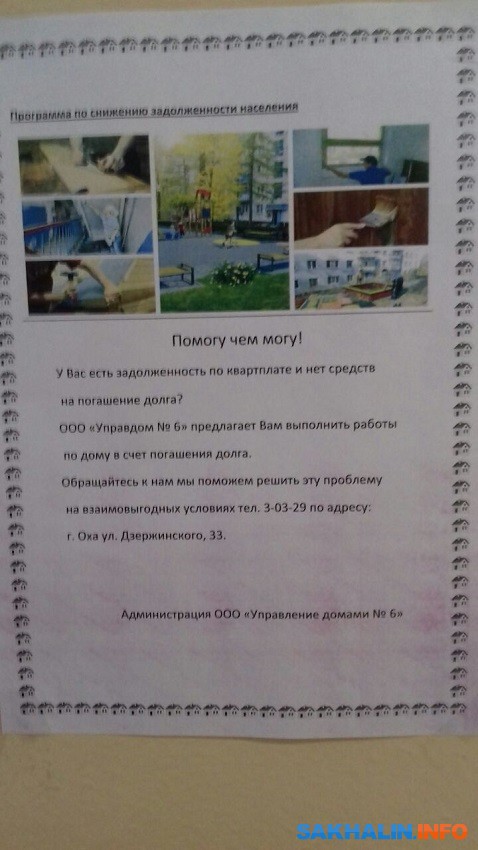 Созданием коллекторских бригад фантазия у охинских "управляшек" не закончилась. "Управдом №6" подошел к сбору долгов креативно. На домах повесили красочные плакаты под названием "Помогу, чем могу!". Предприятие предложило жителям рассчитаться с долгами по коммуналке с помощью работы по дому.