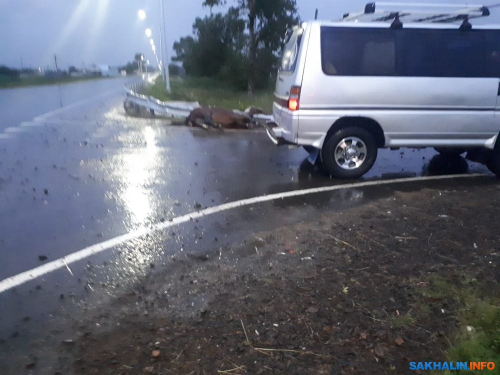 Сегодня около 20 часов на въезде в Тымовское произошло страшное ДТП. Иномарка двигалась по трассе Южно-Сахалинск — Оха. Возле развилки ему под колеса выскочила женщина на лошади. Не успев увернуться или затормозить, водитель врезался в лошадь.