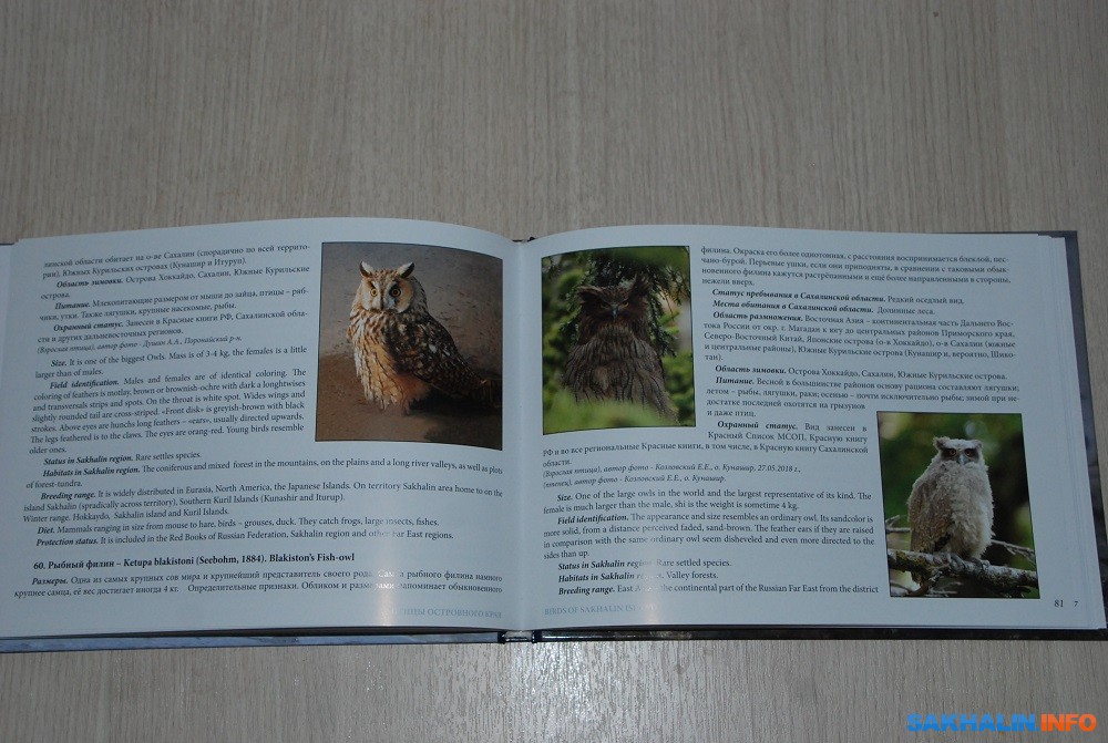 Для тех, кому не повезло приобрести или хотя бы увидеть предыдущие две части, напомним, что все книги с самого начала были задуманы как подарочные. Они изданы на двух языках — русском и английском. Названия птиц даются на трех языках — русском, английском и латинском. Любой человек, посетивший Сахалинскую область, не владеющий английским, сможет у себя в своей стране найти точный перевод названия заинтересовавшей его птицы.