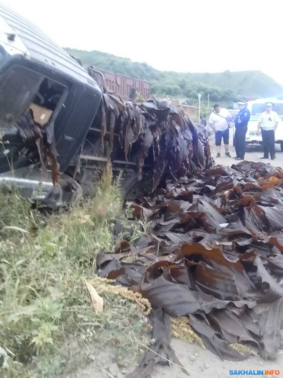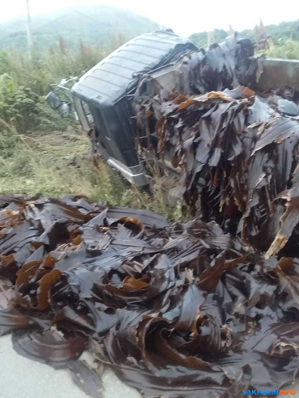 Сегодня около полутора часов назад шедший со стороны села Правды в сторону Холмска грузовик в районе села Прибой съехал с трассы в кювет и лег на бок. Находившаяся в его кузове морская капуста частично высыпалась на землю.