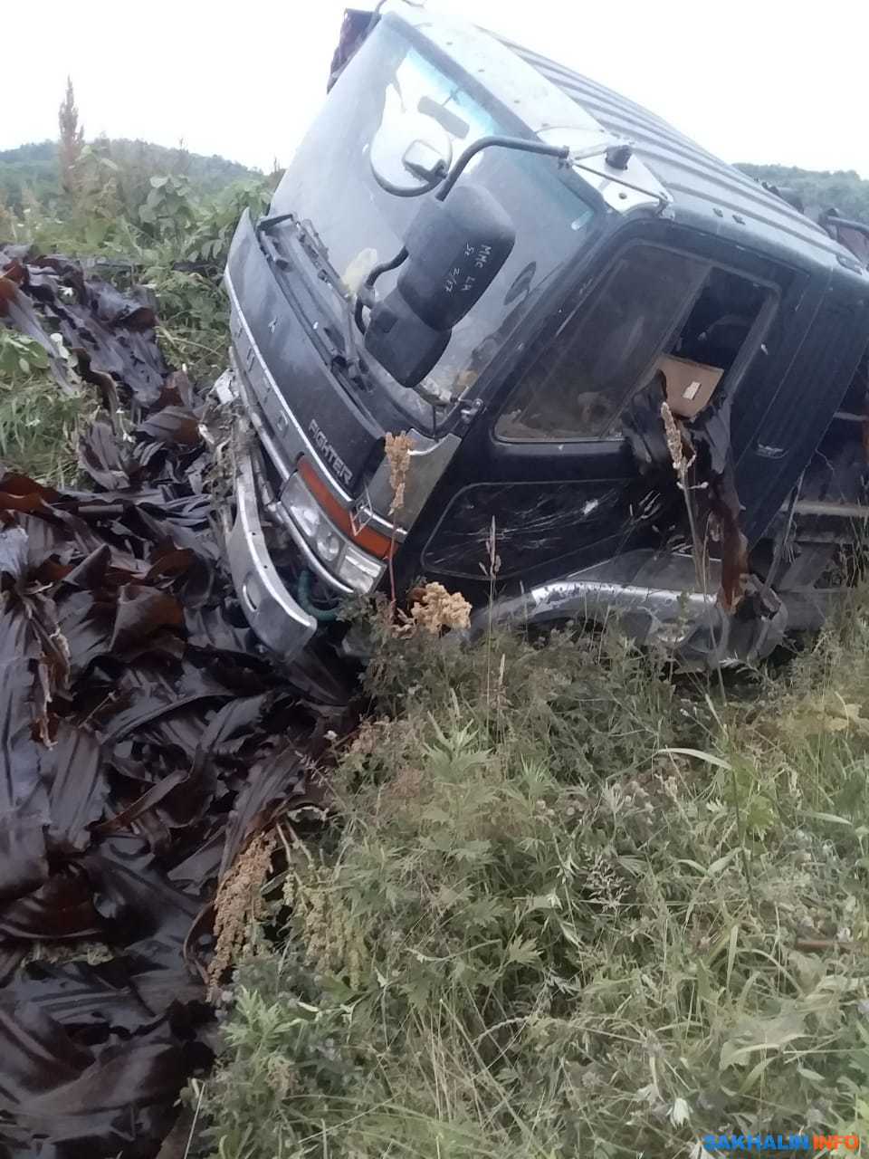 Грузовик с морской капустой лег в кювет в Холмском районе