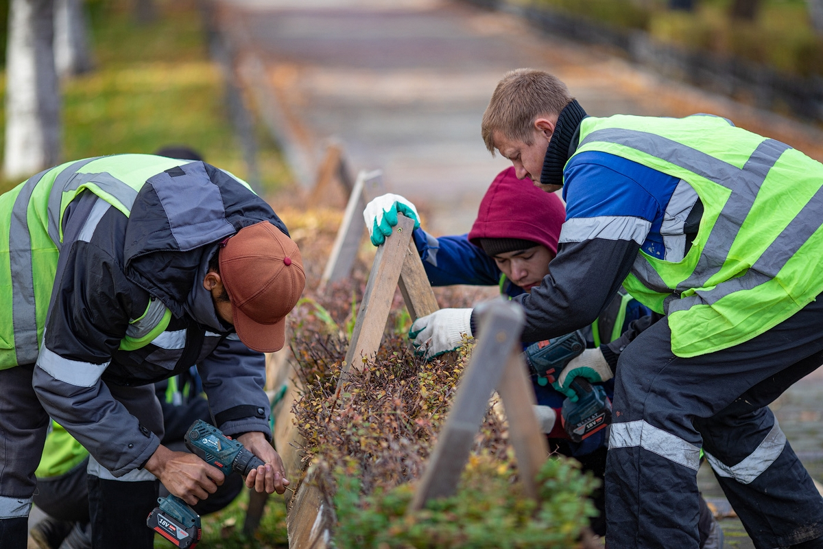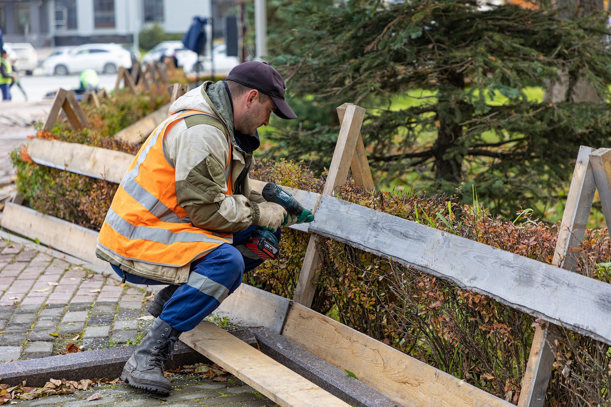 В ведении МБУ "Зеленый город" содержится более 20 скверов, а также десятки клумб и зеленые зоны. На площади Ленина специалисты уже ведут подрезку кустарников роз, которые позднее защитят от вымерзания укрывным материалом. Работники связывают одиночные кустарники, укрывают мешковиной молодые хвойные деревья. Одновременно сотрудники "Зеленого города" монтируют деревянные конструкции, защищающие живую изгородь из кустарников от снежных масс. Это преимущественно барбарис, который нуждается в особой защите, чтобы небольшие кусты не раздавило снегом.