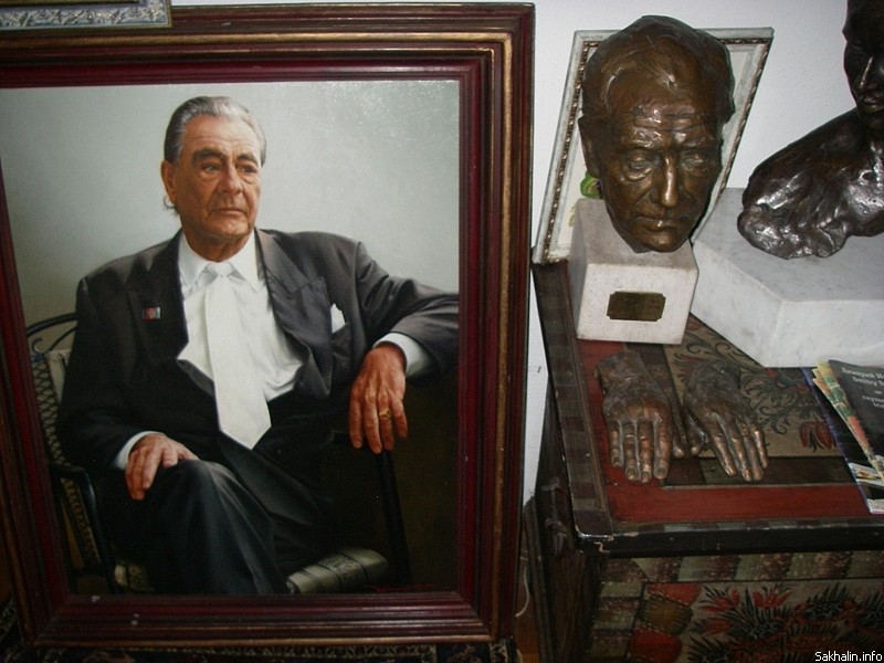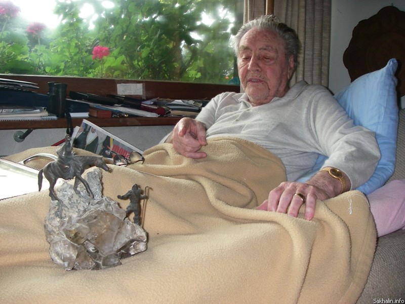 Разуваемся и в мокрых дождевиках идём вперёд. В конце зала рядом с инвалидным креслом видим кровать, вокруг неё бронзовые бюсты, стопы книг, настольные портреты. На кровати с книгой в руке полулежит человек, мы уже знаем: ему 98 лет.