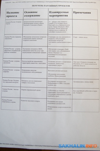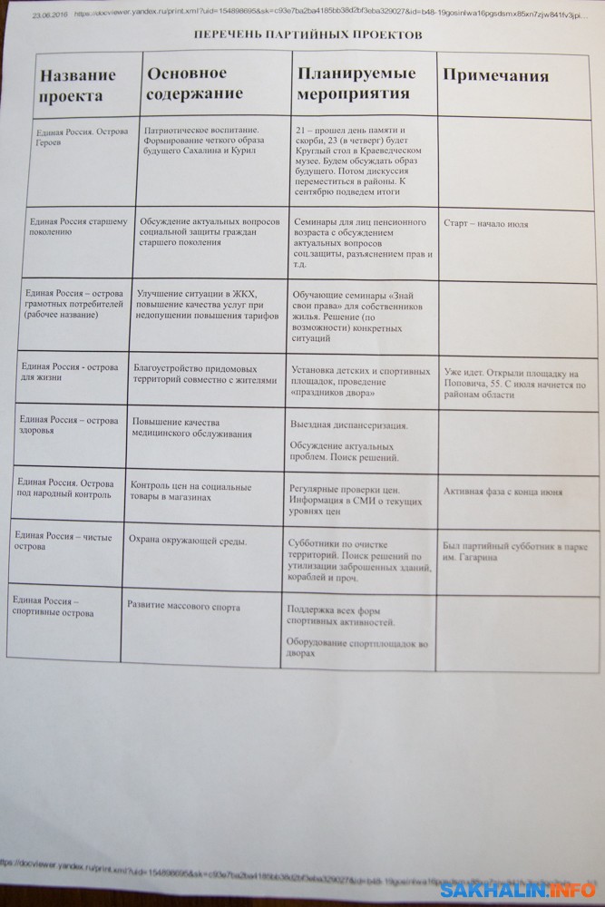 Всего таких проектов, как удалось выяснить, сахалинское отделение партии заготовило восемь штук (название каждого, как мантра, начинается с "имени" партии): "Острова героев", "Старшему поколению", "Острова грамотных потребителей", "Острова для жизни", "Острова здоровья", "Острова под народный контроль", "Чистые острова" и "Спортивные острова".