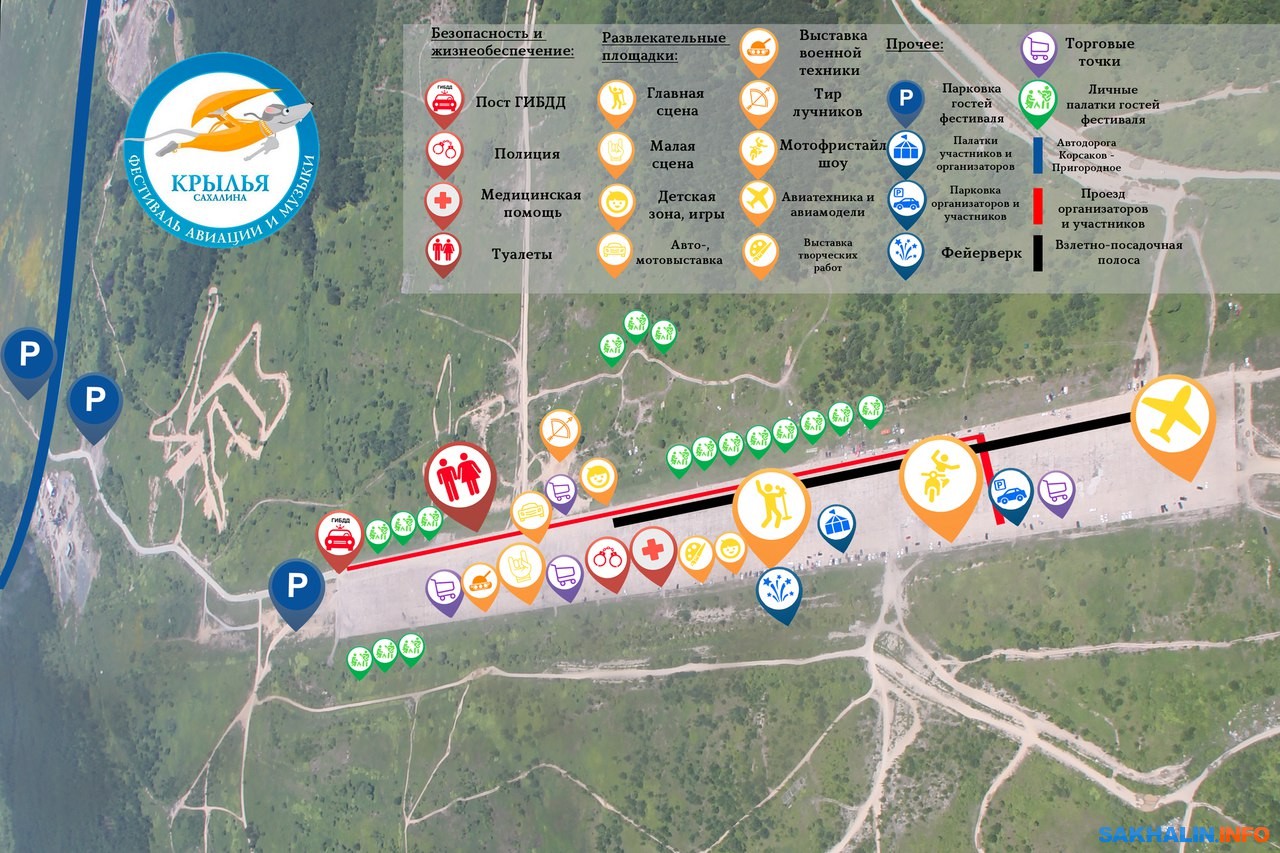 И все же организаторы осознают, что многие отправятся на фестиваль на личных автомобилях. Для них подготовлены три парковки (смотрите схему) и самая большая из них размещена на грунтовой взлетно-посадочной полосе (как в 2014 году). Вторая парковка будет в начале грунтовой дороги при повороте на Пушистый, третья — на поле через трассу Корсаков — Пригородное. На парковках будут работать волонтеры и сотрудники ГИБДД.