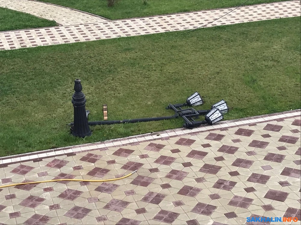 Последствия вчерашнего тайфуна "Талим" предстоит устранять не только южно-сахалинским коммунальным службам, но и служителям церкви. На территории кафедрального собора Рождества Христова ветром повалены два кованых фонаря и еще несколько наклонены. Декоративные светильники придется выравнивать или менять.