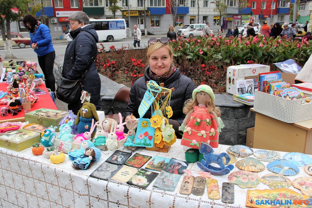 Внимание привлек стол с деревянными поделками мастера по японской столярной технологии и инструменту Виктора Мещерякова. А вообще с сувенирной индустрией у нас плохо, темно, как в лесу. Кажется, Сахалину отчаянно не хватает ремесленников.