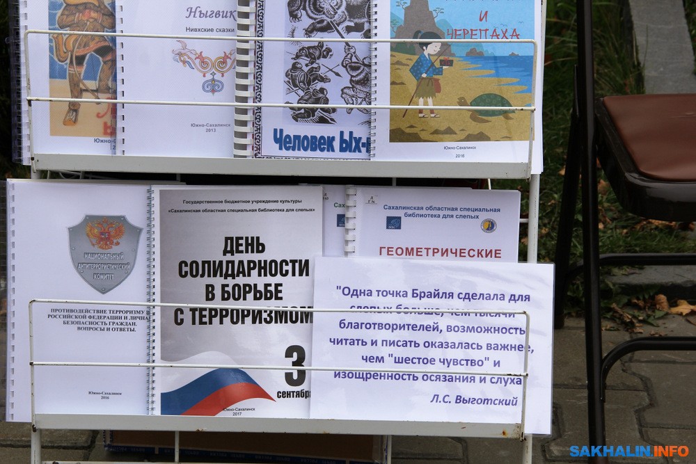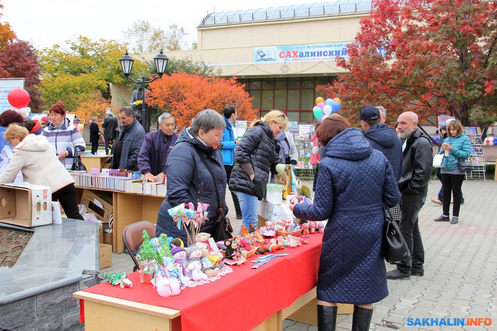 Библиоярмарка "Сахалинский Арбат", несмотря на понедельник и ненастную погоду, собрала сегодня сотни любителей книги. В сквере областной научной библиотеки в полдень появились столы, палатки и стенды местных издателей, авторов книг, продавцов печатной продукции, к ним присоединились и продавцы сахалинских сувениров. Ярмарка проходит на Сахалине уже в седьмой раз.