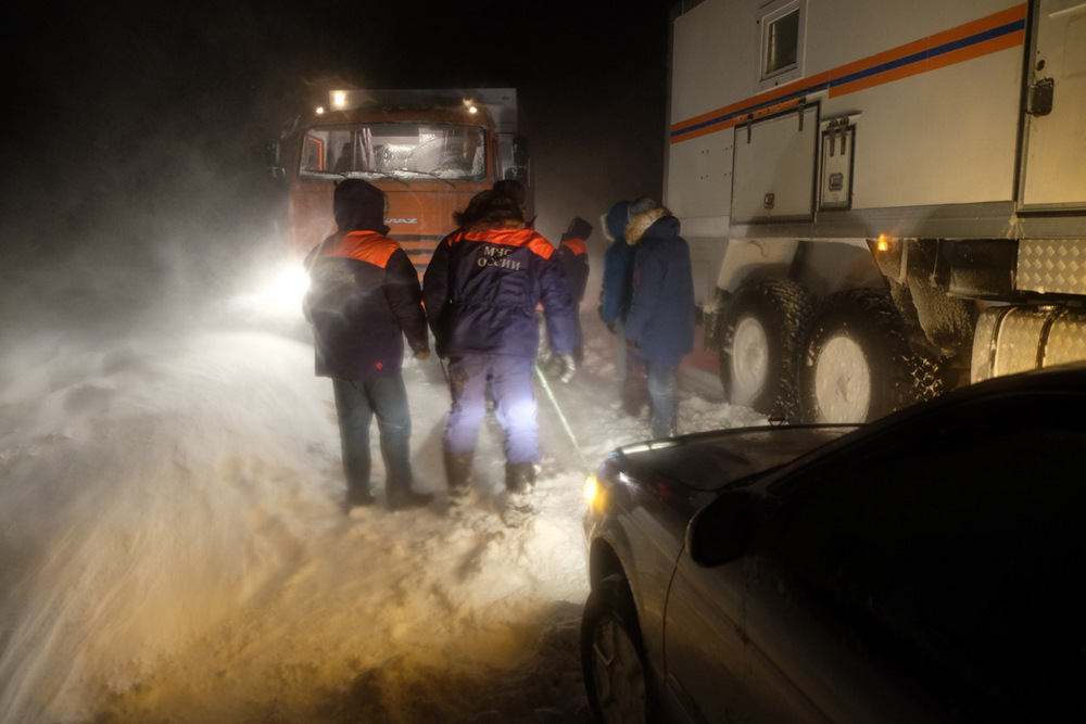 Только для того, чтобы добраться из Южно-Сахалинска до машин, попавших в снежную ловушку, потребовалось около 6 часов. Спасателей, которые двигались на четырех автомобилях повышенной проходимости, сопровождала снегоуборочная техника. Периодически в условиях нулевой видимости и ураганного ветра ей приходилось останавливаться и расчищать трассу от переметов. По пути следования из снега вызволялись застрявшие автомобили, которые ехали с севера на юг острова.