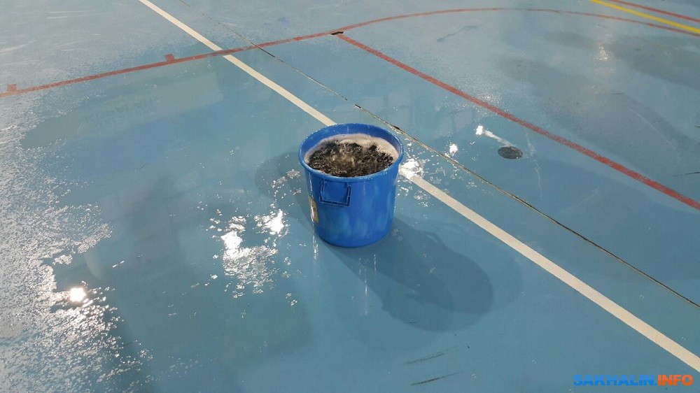 — Он течет с момента, как его построили (здание сдали в 2009 году по типовому проекту, таких объектов в регионе три: волейбольный центр в Южно-Сахалинске, "Дельфин" в Охе и "Арена" в Ногликах), — вспоминает соавтор Sakh.com. — Вот снова пошел дождь, и одно ведро полностью заполняется за час. Неоднократно говорили об этой проблеме, но никаких результатов не видно за годы.