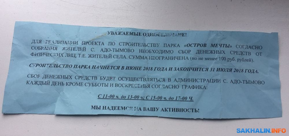 В редакцию ИА Sakh.com обратился житель Адо-Тымово. В населенном пункте появились объявления о том, что администрация села собирает деньги для реализации проекта по строительству парка "Остров мечты".