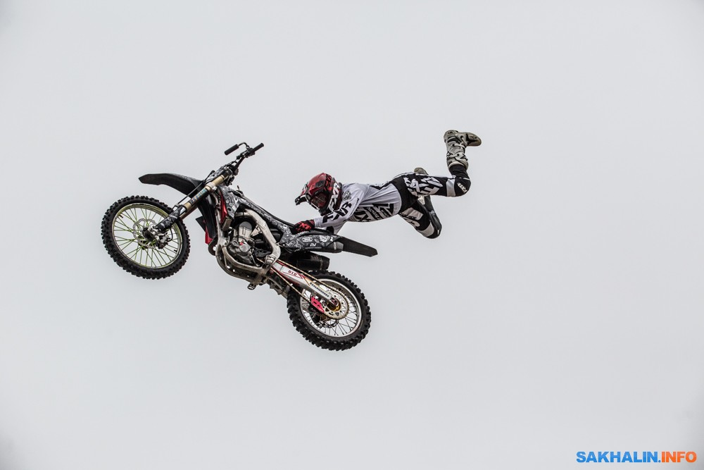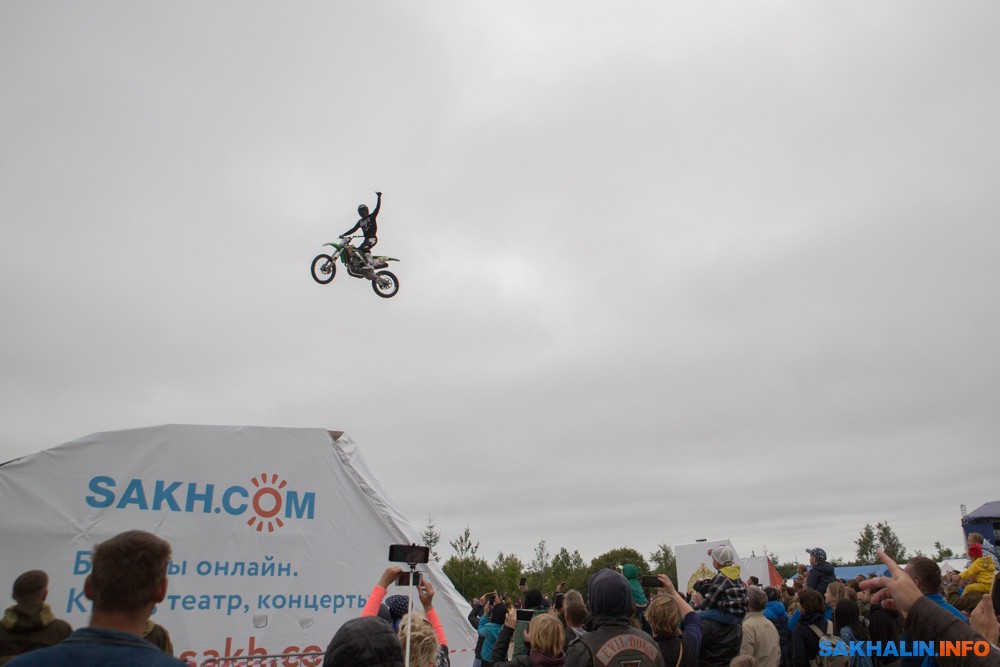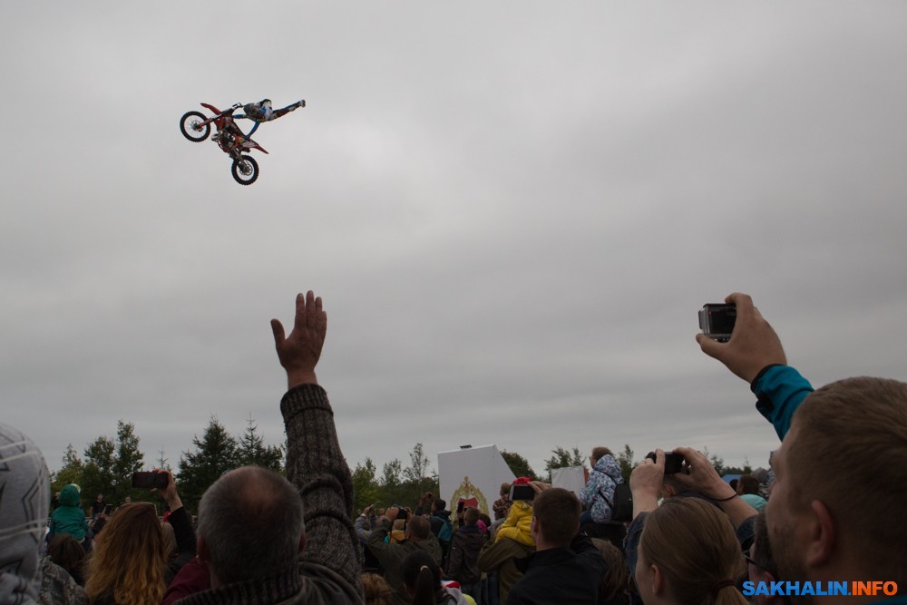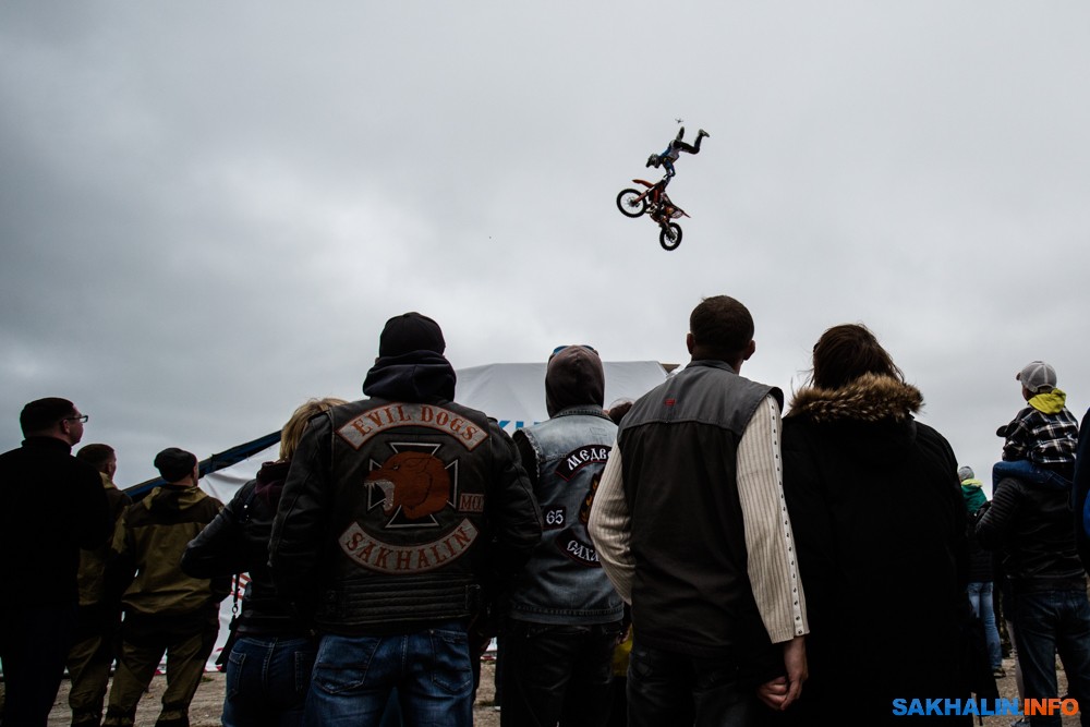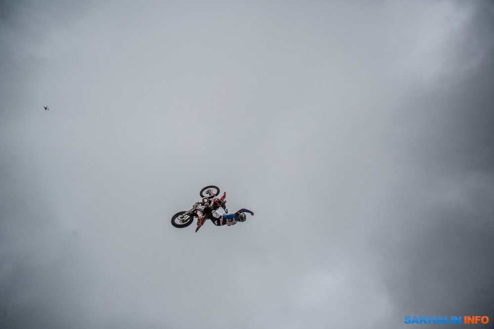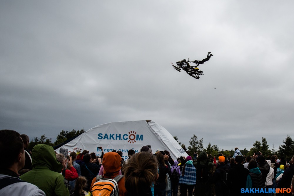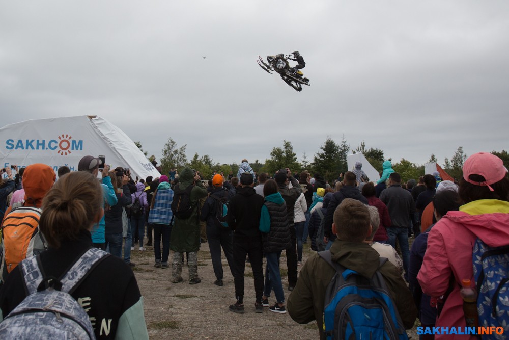 К сожалению, развернуться на полную спортсменам в этом году не позволила погода — шквальный ветер и периодическая морось заставляли их выполнять трюки по самой границе оправданного риска. Поэтому программа, участие в которой принял даже снегоход, получилась примерно в три раза короче. Вообще, судя по истории прошлых визитов летающих мотоциклистов на острова, с климатом Сахалина у них какие-то свои очень сложные взаимоотношения.
