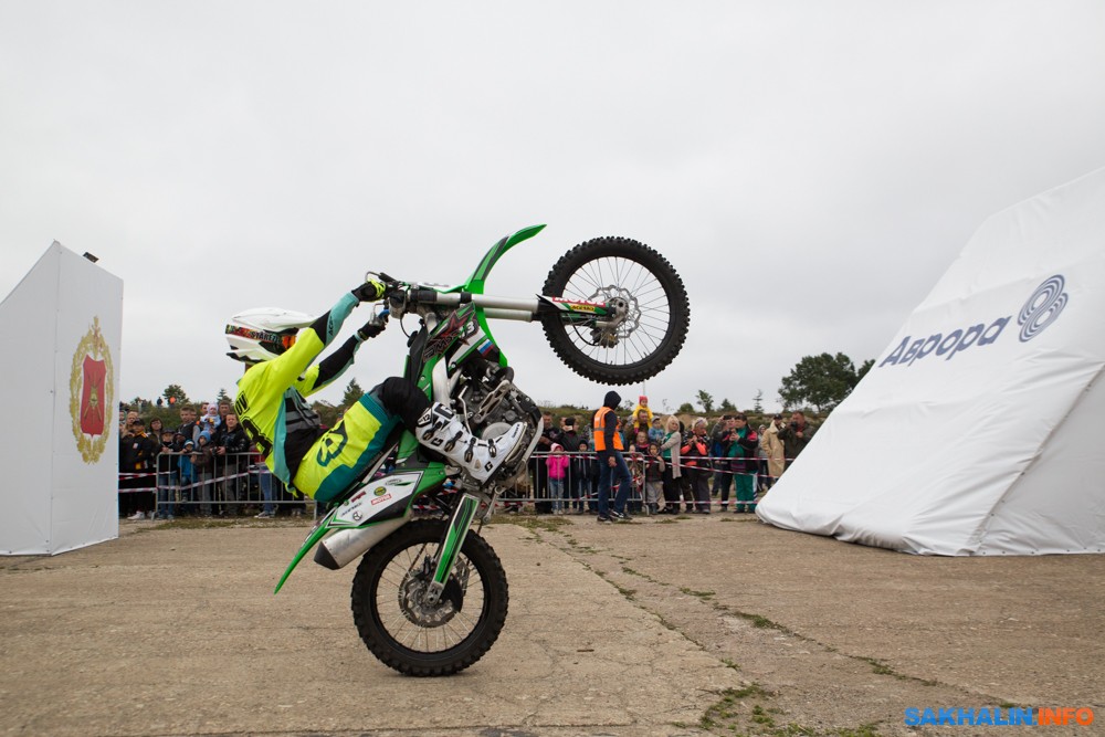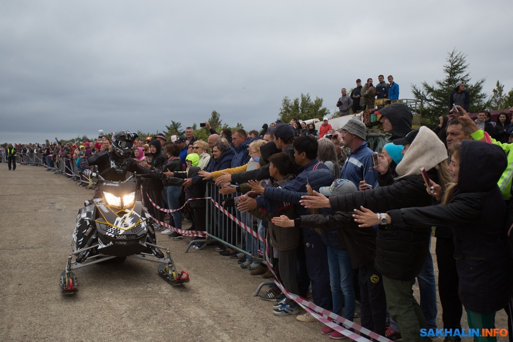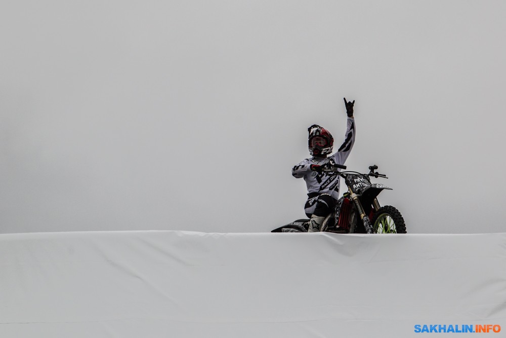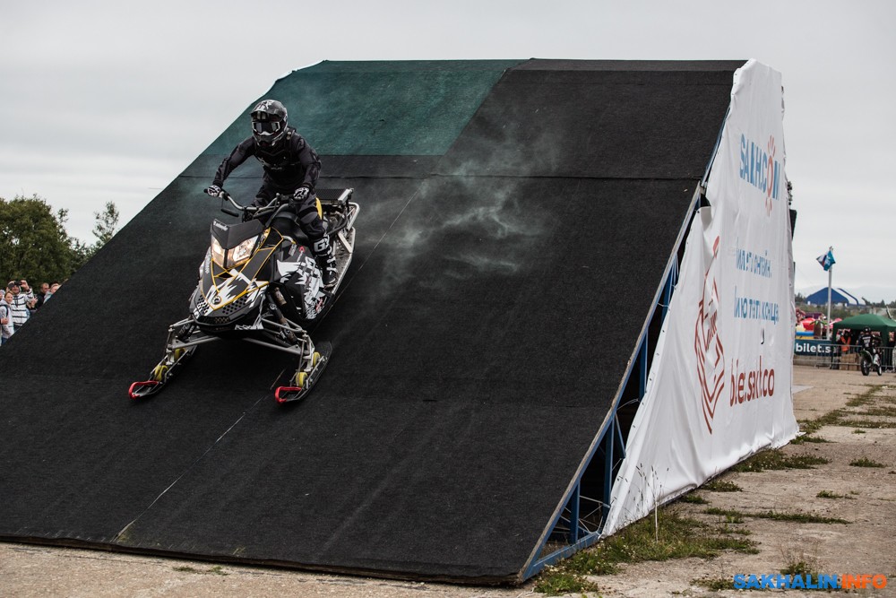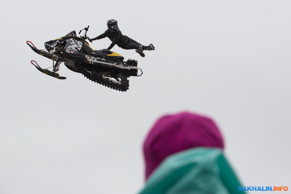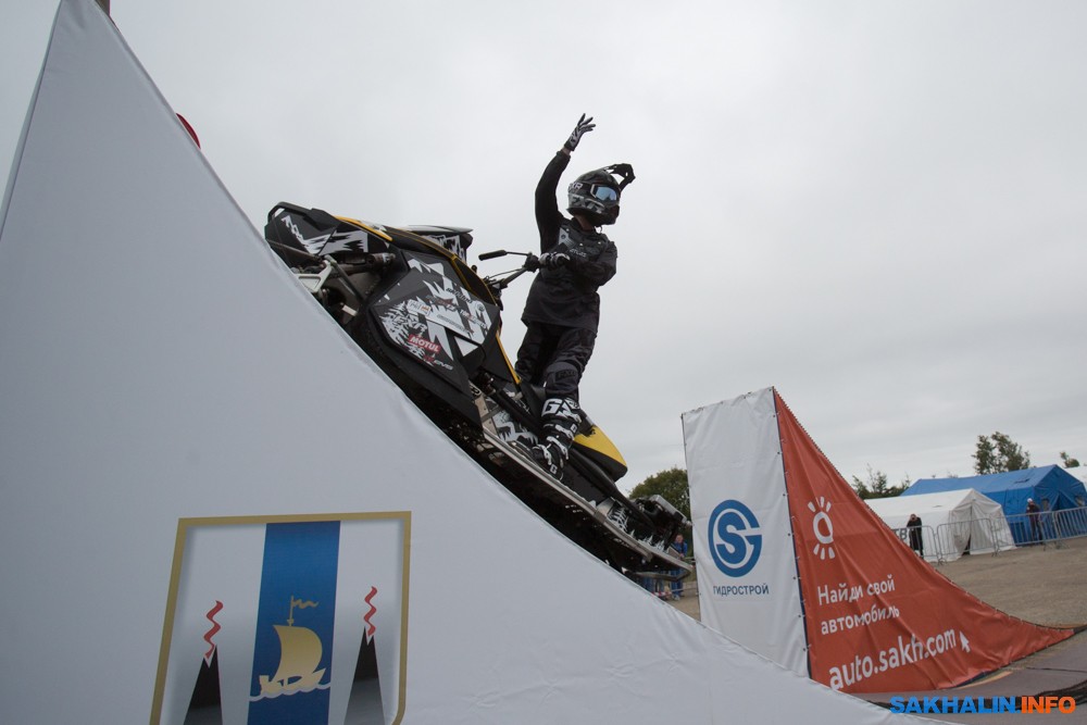 К сожалению, развернуться на полную спортсменам в этом году не позволила погода — шквальный ветер и периодическая морось заставляли их выполнять трюки по самой границе оправданного риска. Поэтому программа, участие в которой принял даже снегоход, получилась примерно в три раза короче. Вообще, судя по истории прошлых визитов летающих мотоциклистов на острова, с климатом Сахалина у них какие-то свои очень сложные взаимоотношения.