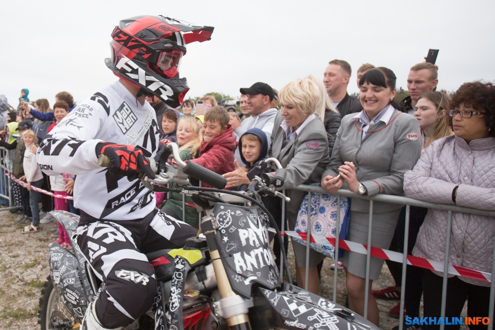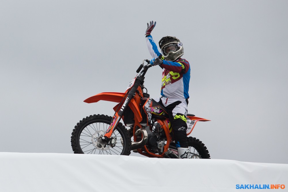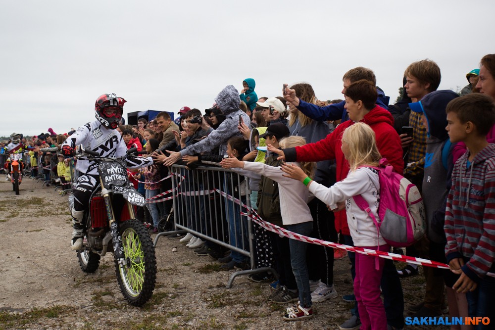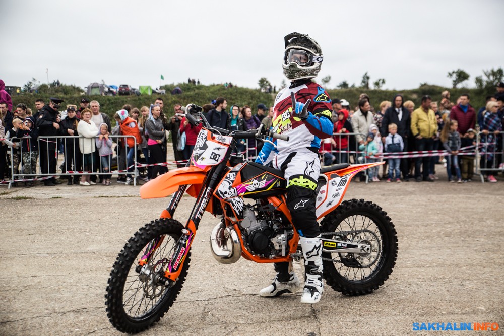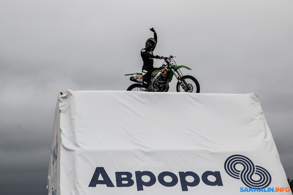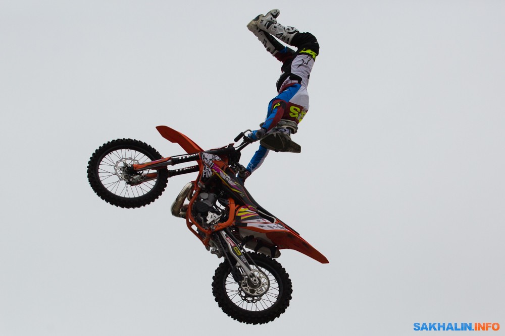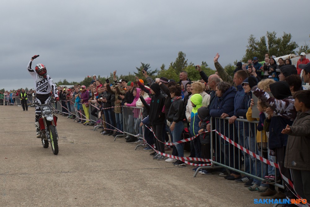 К сожалению, развернуться на полную спортсменам в этом году не позволила погода — шквальный ветер и периодическая морось заставляли их выполнять трюки по самой границе оправданного риска. Поэтому программа, участие в которой принял даже снегоход, получилась примерно в три раза короче. Вообще, судя по истории прошлых визитов летающих мотоциклистов на острова, с климатом Сахалина у них какие-то свои очень сложные взаимоотношения.