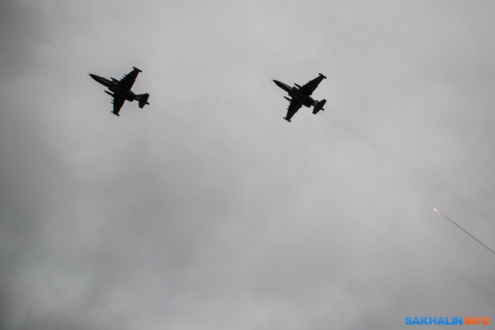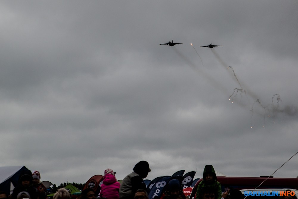 Свой вклад в авиационную часть праздника внесла группировка военных: над аэродромом тандемом прошли два боевых вертолета, а штурмовики Су-25 Восточного военного округа пронеслись над полем на высоте в 170 метров и даже совершили отстрел специальных противоракетных ловушек.