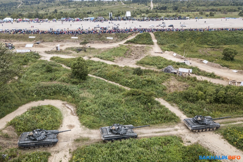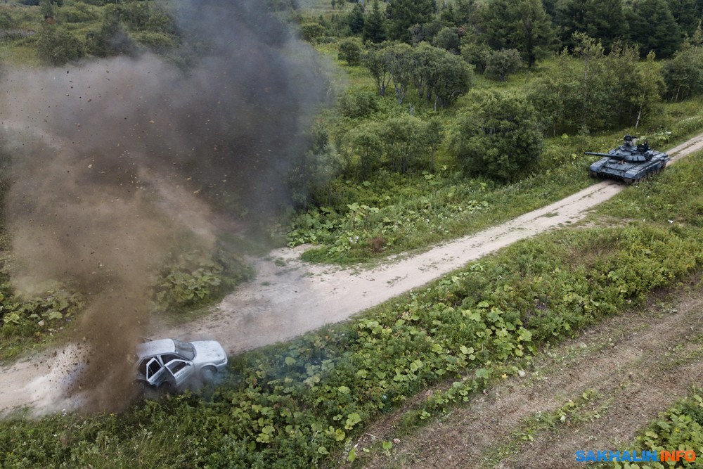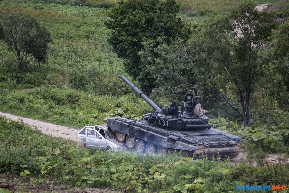 В зрелищной части военнослужащие представили традиционное выступление разведывательной роты и целое шоу с элементами танкового биатлона. Самым запоминающимся моментом "тяжелой" программы оказалось показательное уничтожение седана Nissan Sunny, по которому, не мудрствуя лукаво, прокатились танком.