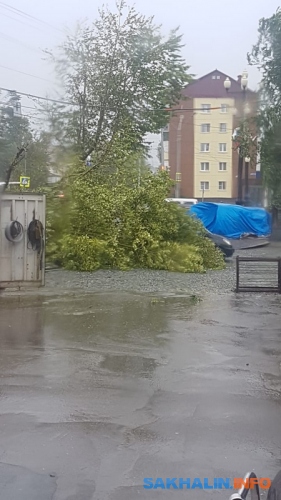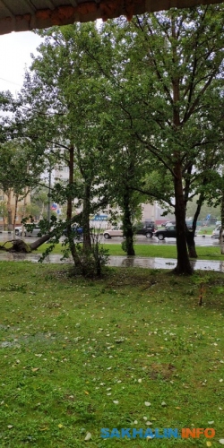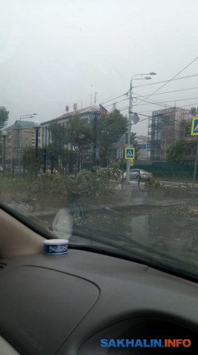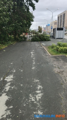 Повсеместное падение деревьев продолжается в областном центре, так, в Луговом дерево перекрыло доступ к домам по улице Северной, 1б и 2. На улице Больничной тополь упал прямо на свежепокрашенный забор Южно-Сахалинского дома-интерната для престарелых и инвалидов.