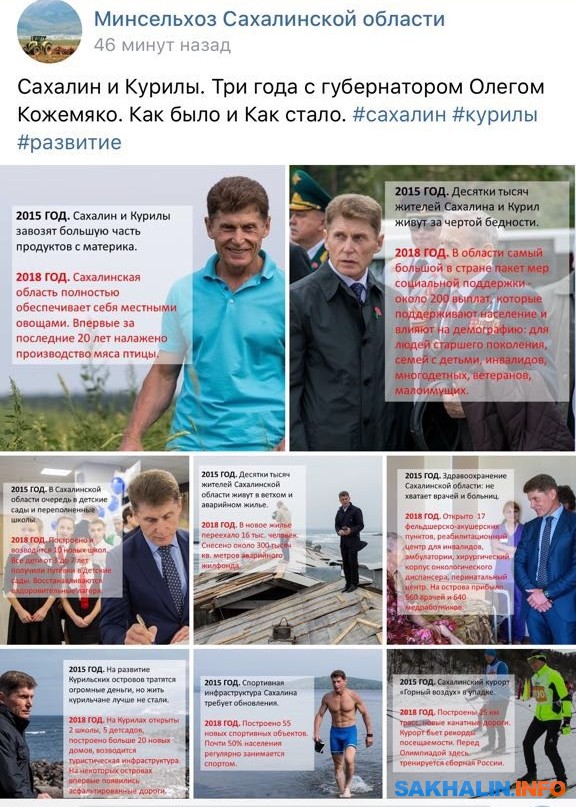 Всем ведомствам и структурам сахалинского правительства приказано опубликовать в социальных сетях презентацию, в которой рассказывается о том, как Сахалин прозябал без губернатора Кожемяко в 2015 году и как он стал процветать в 2018-м. Пример такого рассказа можно сейчас наблюдать в "Инстаграме"* министерства культуры и архивного дела Сахалинской области (то же самое размещено в Instagram*-аккаунте областного минспорта, аккаунтах минобра, министерства ЖКХ, в областного минсельхоза "ВКонтакте", в Facebook* агентства ГО и ЧС Сахалинской области и, видимо, в других аккаунтах). Несколько картинок с фотографиями Олега Кожемяко рассказывают о том, как наш регион якобы преобразился с его приходом. При этом возможность комментирования постов отключена.