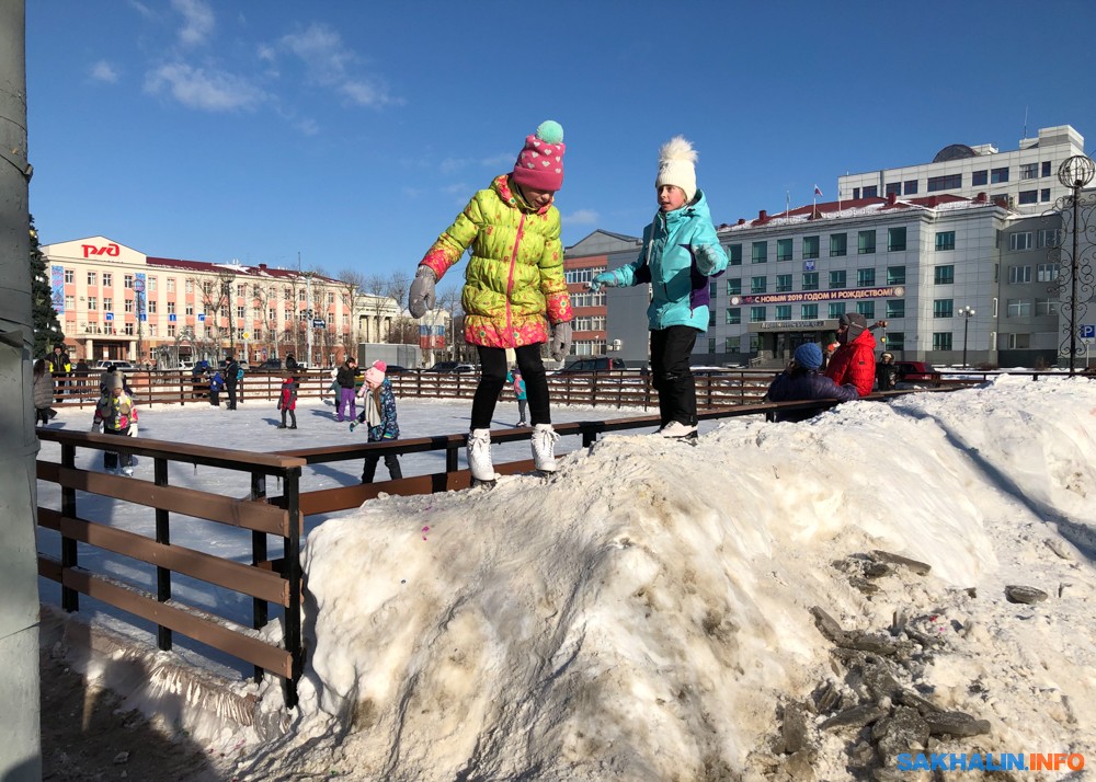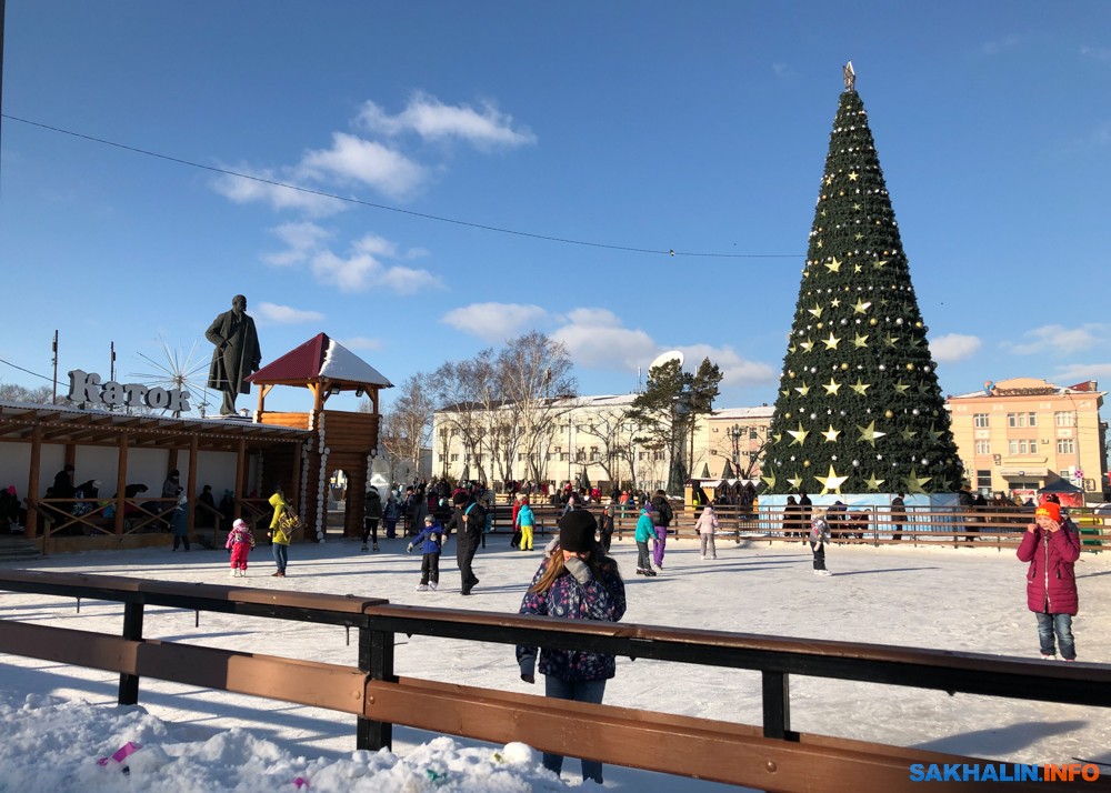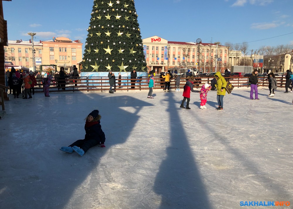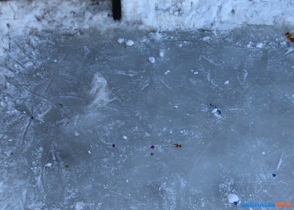 В самом сердце Южно-Сахалинска на площади Ленина залит небольшой каток. Как рассказывают южносахалинцы, "за ним никто не следит", поэтому кататься здесь можно круглосуточно. И действительно, кажется, что за ледовой площадкой не следят. По ней до сих пор катаются, словно перекати-поле, новогоднее конфетти, а вместе с ним фантики от конфет и целлофановые пакетики.