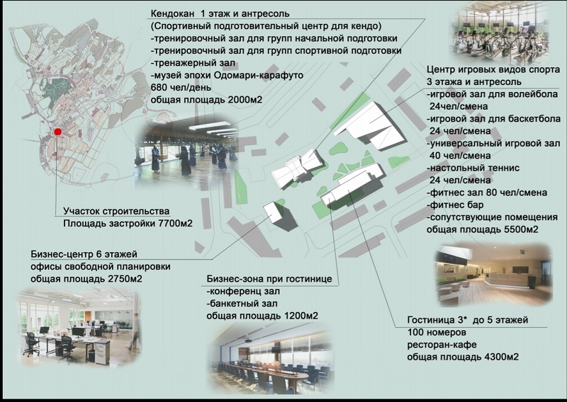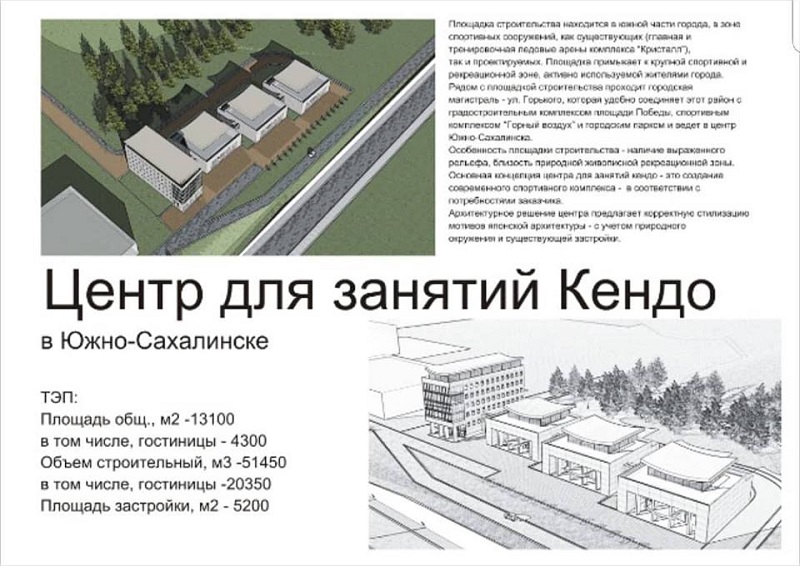 11 марта в областной думе на встрече председателя комитета по спорту, туризму и молодежной политике Олега Саитова, президента и вице-президента ассоциации кендо Сахалина Вадима Полицинского и Эдуарда Медведева был представлен обновленный проект спортивного комплекса "Сахалин кендокан" уже с привязкой к местности. Комплекс планируется разместить на площадке 2,8 га рядом со второй очередью строительства ЛК "Кристалл", которую определила администрация Южно-Сахалинска в конце прошлого года. Концепция проекта разработана одним из известных архитекторов области Татьяной Потаниной. Проект включает в себя три корпуса спортивных залов для групп разного уровня подготовки (с фитнес-центром, классами для теоретической подготовки, медпунктом, центром спортивной экипировки, выставочным залом-музеем эпохи Карафуто и прочими сопутствующими помещениями), гостиницу уровня 3*, офисно-деловой центр, прогулочную зону в восточном стиле, парковки. Комплекс планируется возвести за счет средств частного инвестора.