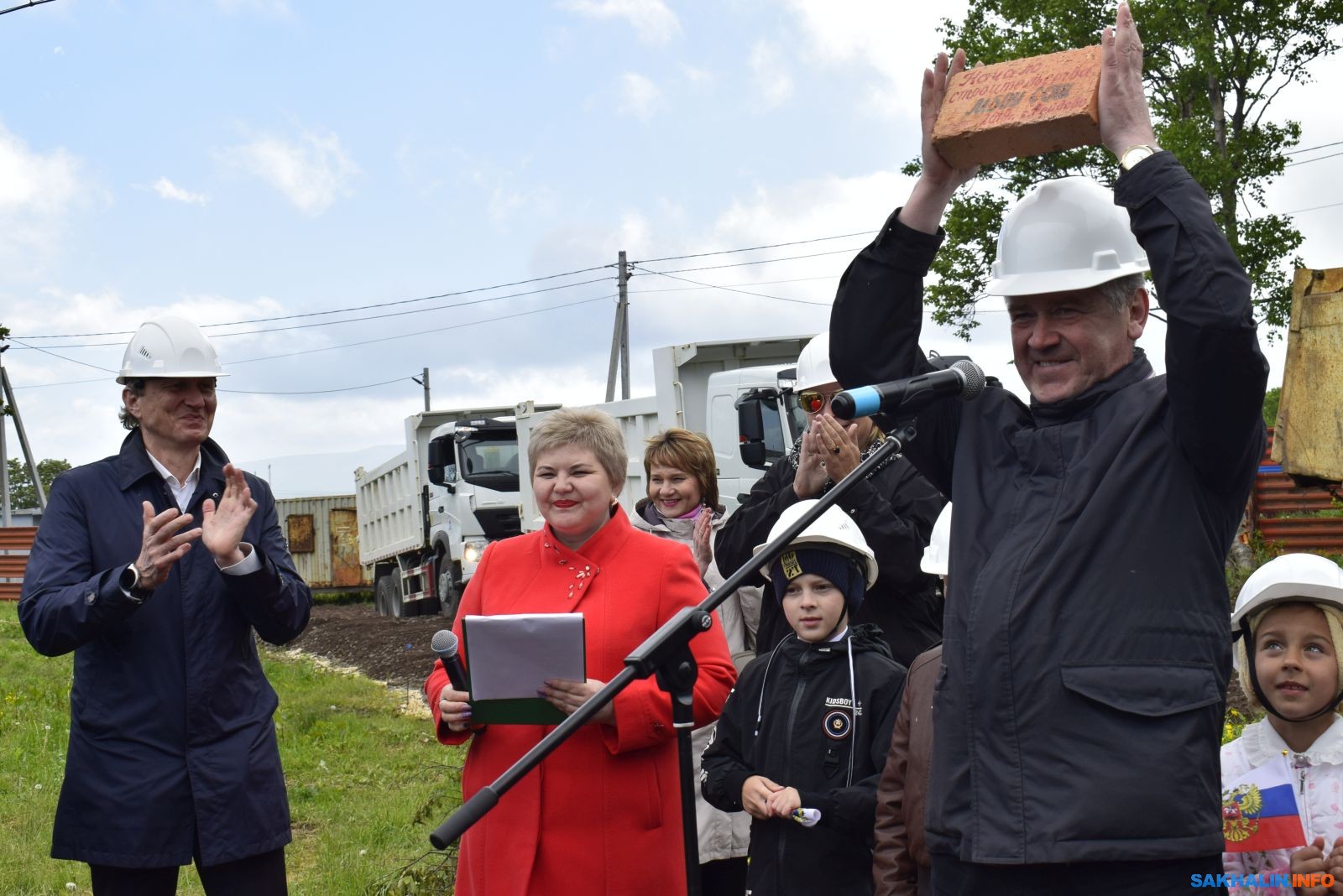 После этих слов глава района Вадим Рокотов передал первый (самый настоящий, не плюшевый) кирпич главному инженеру АО "Гидрострой" Валерию Козинцу.
