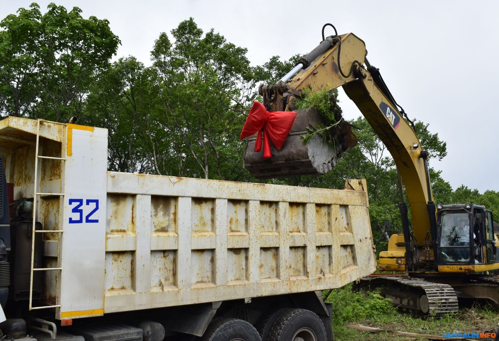 Из колонок грянул Газманов, экскаватор развернулся, зачерпнул ковшом, украшенным большим красным бантом, землицы и отнёс её в кузов грузовика.