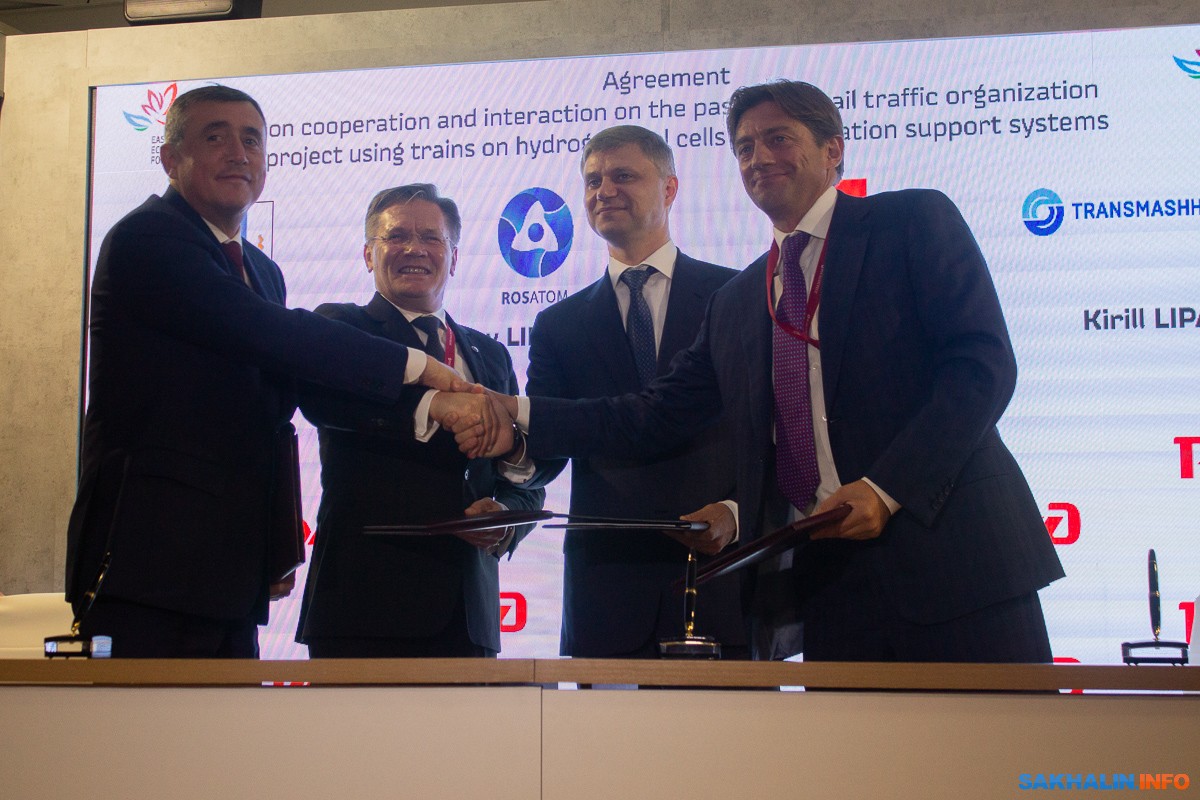 Ещё трое подписантов генеральный директор РЖД Олег Белозеров, генеральный директор корпорации "Росатом" Алексей Лихачёв и генеральный директор "Трансмашинхолдинг" Кирилл Липа. Предполагается, что Сахалин станет полигоном для испытания поездов на водородном топливе.