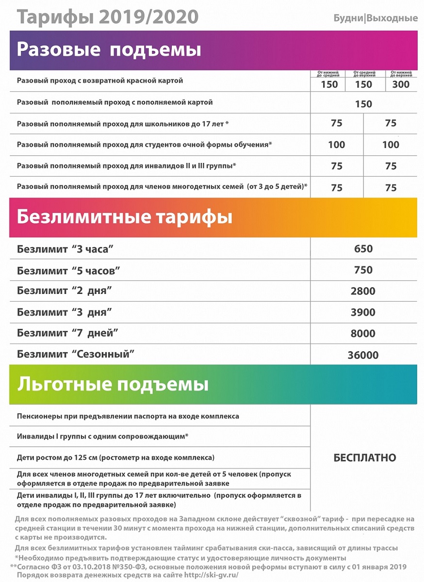 Ассортимент безлимитов представлен шестью позициями: на три (650 рублей) и пять (750 рублей) часов, два (2800 рублей), три (3900 рублей) дня, неделю (8000 рублей) и весь сезон (36 000 рублей). Для безлимитных тарифов на проходных комплекса, как и прошлой зимой, предусмотрен тайминг срабатывания, зависящий от длины трасс.