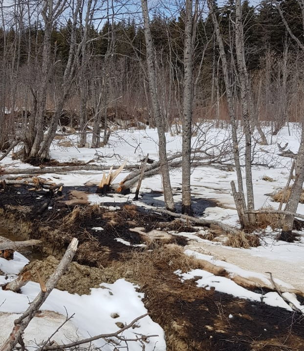 Об этом разливе местные жители рассказали "Экологической вахте Сахалина" лишь в самом конце апреля. В начале мая охинские волонтеры общественной организации обследовали место происшествия и установили, что нефтеразлив до сих пор не ликвидирован, а "Сахалинморнефтегаз" очищает загрязненную местность очень вяло. При этом нефтяная пленка и сгустки нефти наблюдаются на поверхности воды реки Хугузка и ниже всех заграждений, устроенных нефтяниками — а это означает, что продолжается нефтяное загрязнение не только реки, но и залива Пильтун. Из-под снега вытаивают все новые площади загрязненной нефтью почвы, не охваченные работами по очистке, которые ведутся достаточно медленно и пассивно, о чем говорит сама их продолжительность — с момента разлива прошло уже более трех месяцев, однако его ликвидация еще далека от завершения. На момент обследования волонтеров "Эковахты Сахалина" уборку нефти никто не производил.