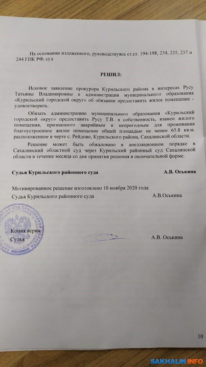 В распоряжении редакции имеется решение районного суда от 2 ноября 2020 года с участием зампрокурора Курильского района Анастасии Романовой, которое подтверждает, что прокуратура все же отстояла право жительницы Рейдово Т. Русу (мать Натальи) на получение именно жилья взамен аварийного, а не компенсации. Судья Курильского районного суда Сахалинской области Анна Оськина назвала доводы администрации района "несостоятельными и не имеющими правового значения для рассмотрения настоящего спора".