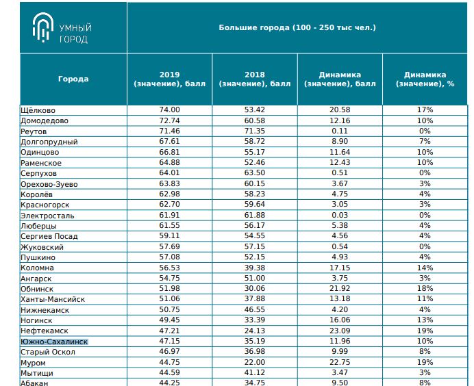 По результатам рейтинга за 2019 год в категории "Большие города" Южно-Сахалинск занял 23-е место (поднявшись на 6 позиций) среди 94-х городов страны с численностью населения от 100 до 250 тысяч человек. По итогам 2019 года индекс островной столицы составил 47,15, в прошлом году — 35,19. В тройке лидеров в данной группе оказались города Щелково — 74,00 (+21%), Домодедово — 72,74 (+12%) и Реутов — 71,46 (+1%).