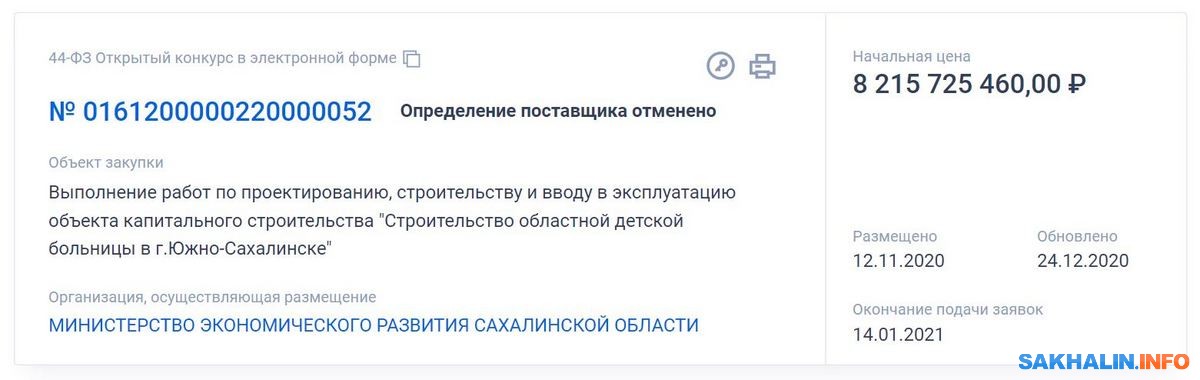 Строительство новой детской областной больницы на Сахалине продолжает встречаться с различными проблемами. В ноябре неожиданно был объявлен конкурс на возведение объекта за , оказалось, что часть средств региону федеральный бюджет. Это стало ключевым фактором в появлении закупки, потому что предыдущий тендер был отменен .