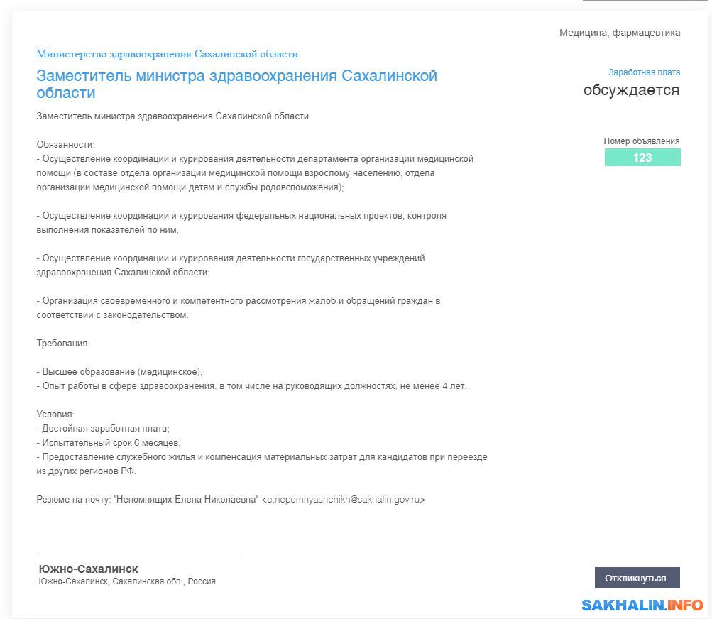 Самые "жирные" вакансии представлены на первых страницах. Так, области нужен новый директор "Горного воздуха", два заместителя министра здравоохранения и первый заместитель министра жилищно-коммунального хозяйства. Ищут также замминистра архитектуры и градостроительства, вице-мэров в Аниву, Смирных и Ноглики, а заодно директора краеведческого музея в Оху.