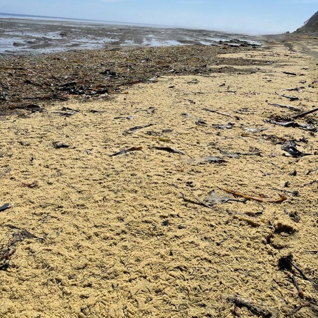 На берегу залива Анива, в районе Нечаевки Корсаковского района, штормом выбросило на берег огромное количество икры, которую ранее отметали в прибрежной зоне, об этом в Facebook* сообщает руководитель "Экологической вахты Сахалина" Дмитрий Лисицын.