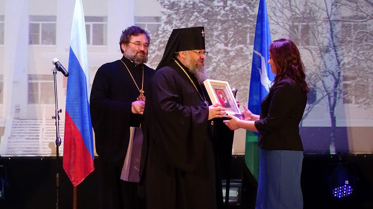 Затем на сцену поднялся областной министр туризма Артём Лазарев, архиепископ Южно-Сахалинский и Курильский Никанор, председатель ощбщественного совета при мэре городского округа Николай Петров, он вручил наказы жителей городского округа, поступившие во время избирательной компании, и которые необходимо исполнить в течение следующих пяти лет.