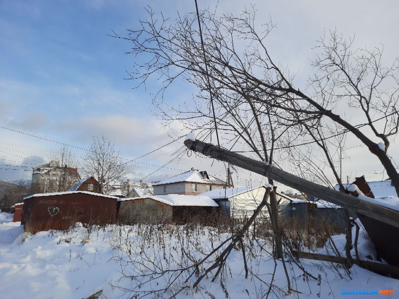 Повисший на проводе столб несколько дней ждет южно-сахалинских энергетиков