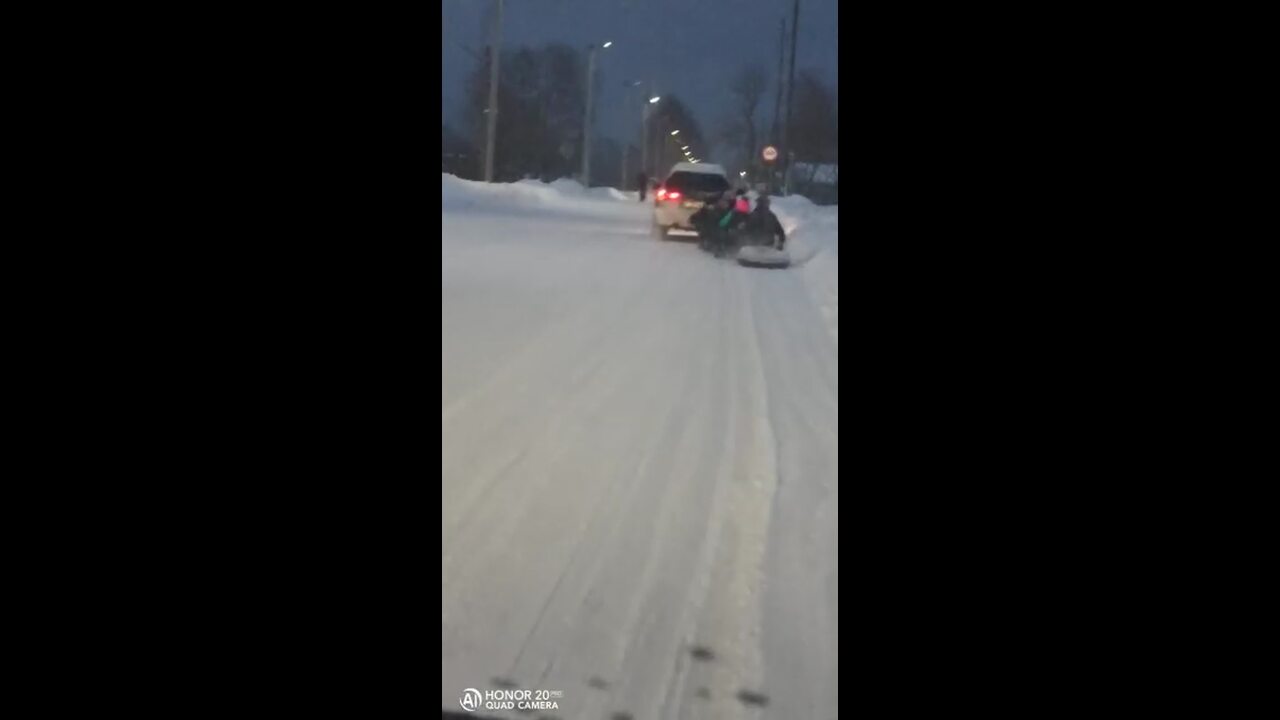 Жители Чехова сегодня вечером стали свидетелями опасного для жизни досуга, который организовал для детей один из автолюбителей. Он привязал к своей машине аргамаки и ватрушки и начал катать восьмерых сахалинцев по дорогам села.