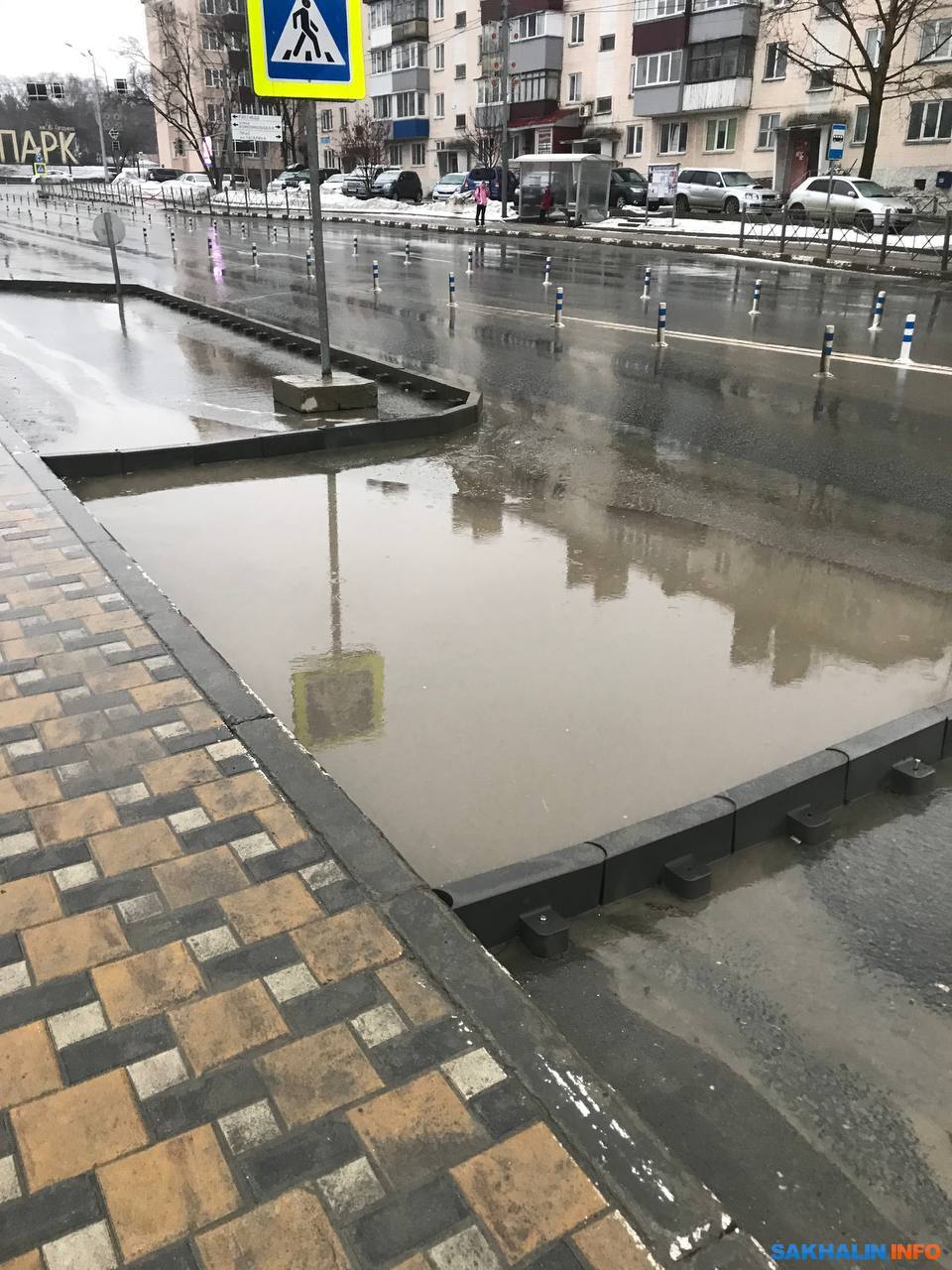 Появление кольца на пересечении улиц Сахалинской и Комсомольской в областном центре и сопутствующие изменения в организации дорожного движения принесли проблему для пешеходов. Специалисты приняли решение перенести существующий пешеходный переход восточнее, ближе к перекрестку, а для безопасности горожан, решивших пересечь проезжую часть, при помощи бетонных блоков огородили небольшие островки до и после перехода. Но эти блоки стали действовать как запруда, задерживая во время дождя воду. И пешеходный переход превратился в небольшой пруд.