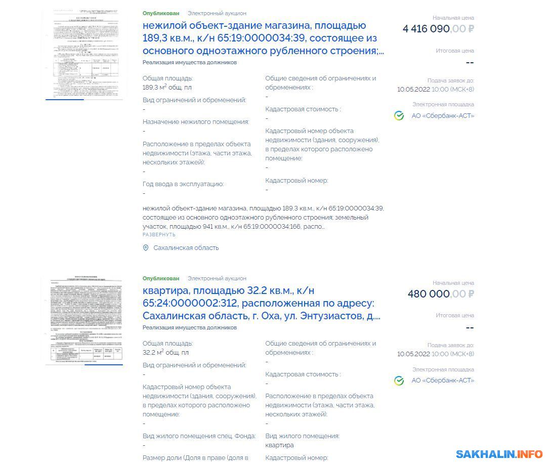 Основанием для продажи стали постановления судебных приставов. Заявки на участие в торгах можно подать до 10 мая, а сами они состоятся 16 мая. Прошлая новость об аукционе заинтересовала почти 30 тысяч сахалинцев, так что борьба за дешевое имущество во время кризиса может оказаться серьезной.