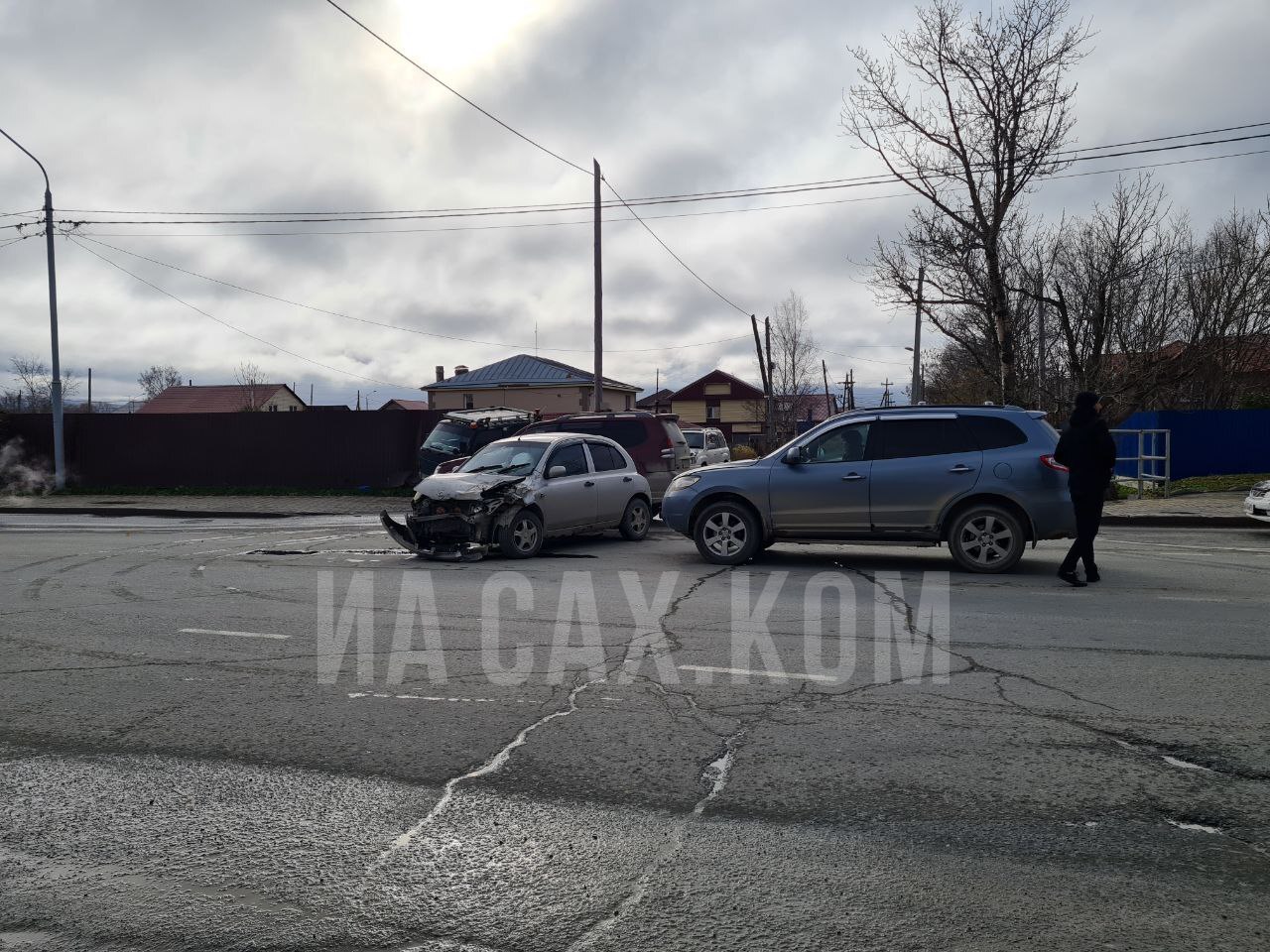В Южно-Сахалинске на перекрестке улиц Сахалинской и Проточной стоит помятый Nissan March. Рядом с разбитым автомобилем припаркован невредимый кроссовер, вероятнее всего, — подмога водителя "Марча". Поблизости с местом аварии не видно других участников ДТП, но подозрительно "уставшим" выглядит грузовик, стоящий на тротуаре со спущенным колесом.