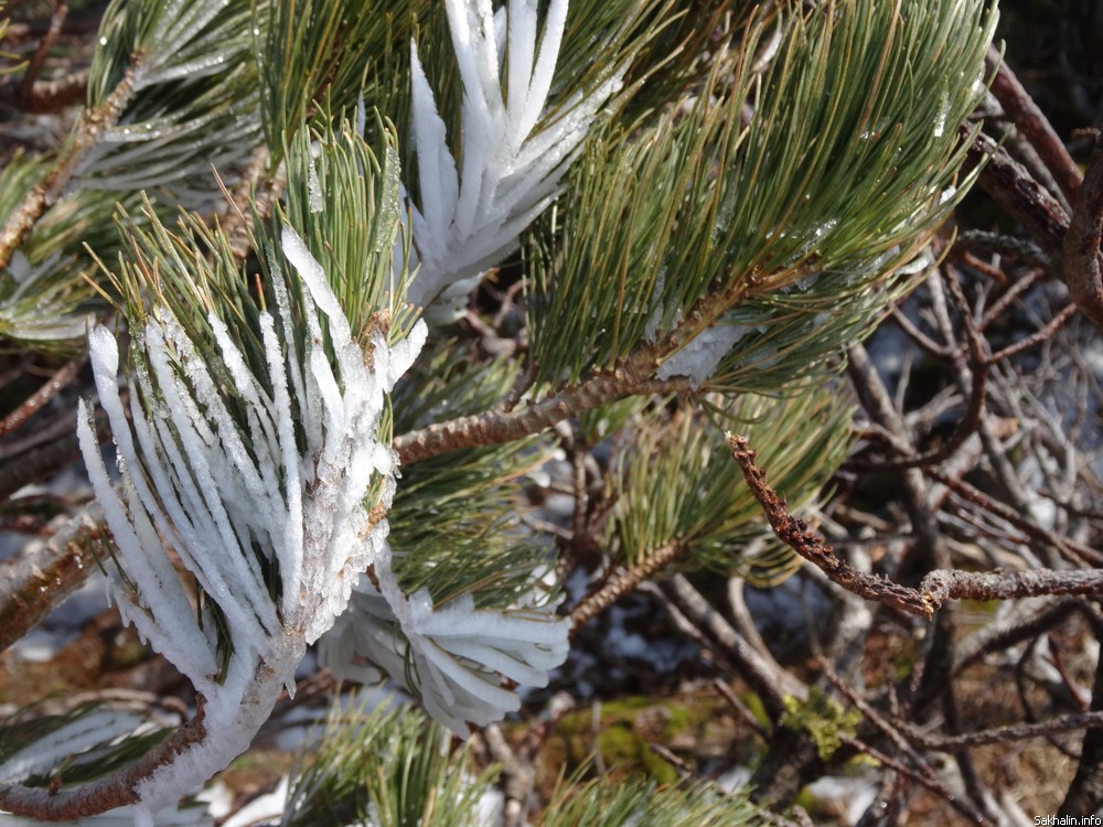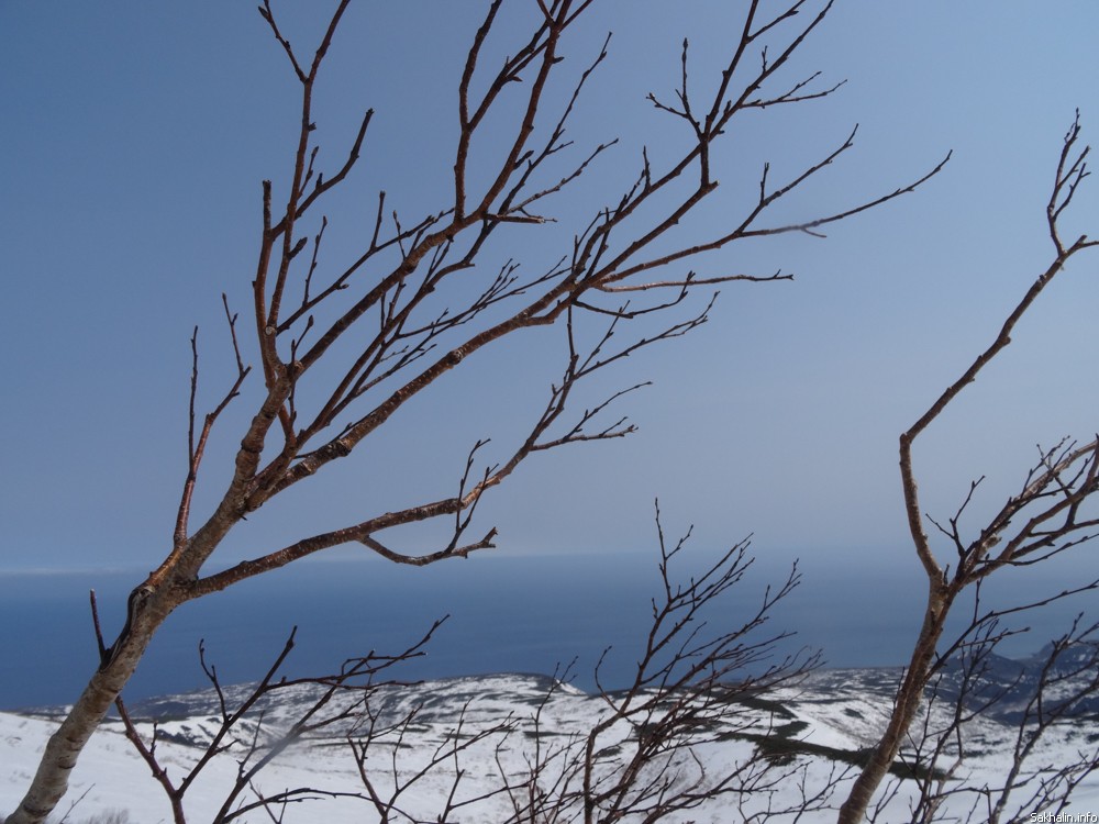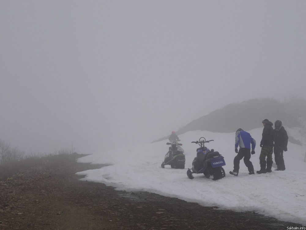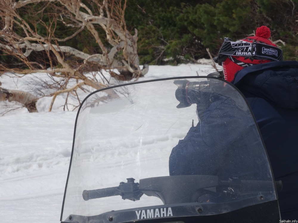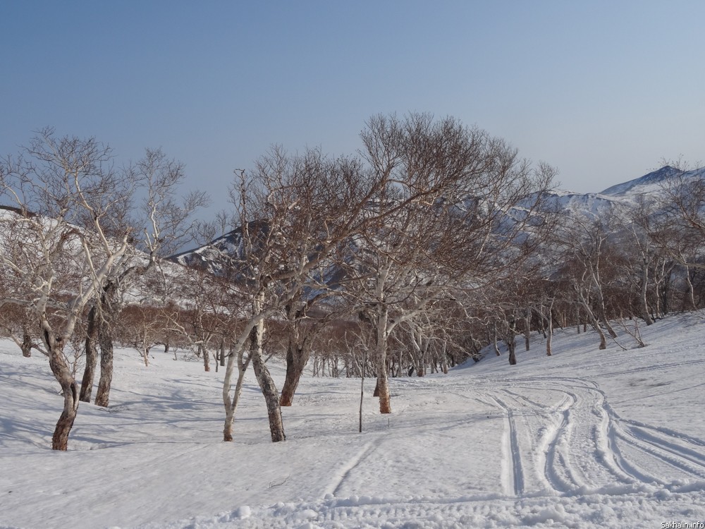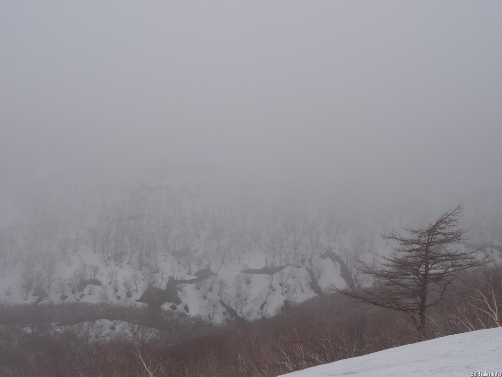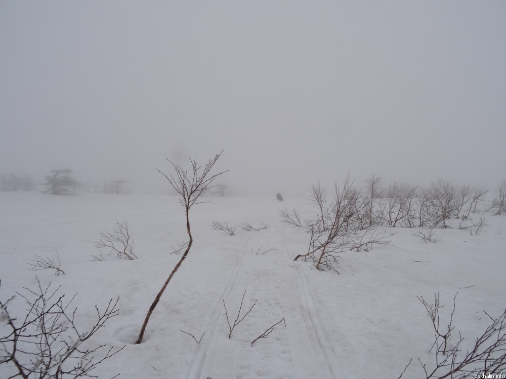 Первое сравнение, которое приходит в голову, — вечное утро. Причудливые курильские березы заламывают руки, умоляя освободить их из туманного плена. Вулкан Богдана Хмельницкого, вид на который в ясную погоду отсюда прекрасный, тонет в невесомой подушке облака. Если выключить моторы, тишина нереальная. Это начало марта, в Курильске уже почти не осталось снега, а здесь зима, как невеста в летаргическом сне, — кажется, никогда не пробудится, пусть зарычат хоть сто снегоходов.