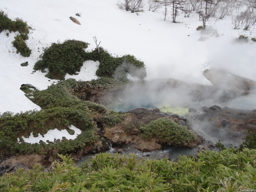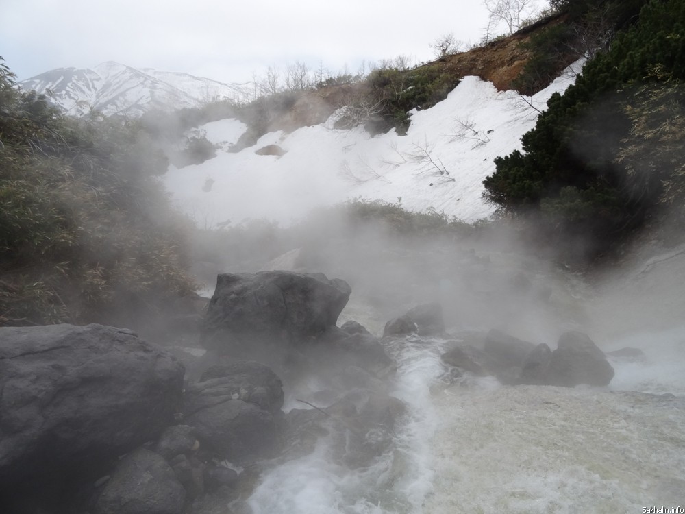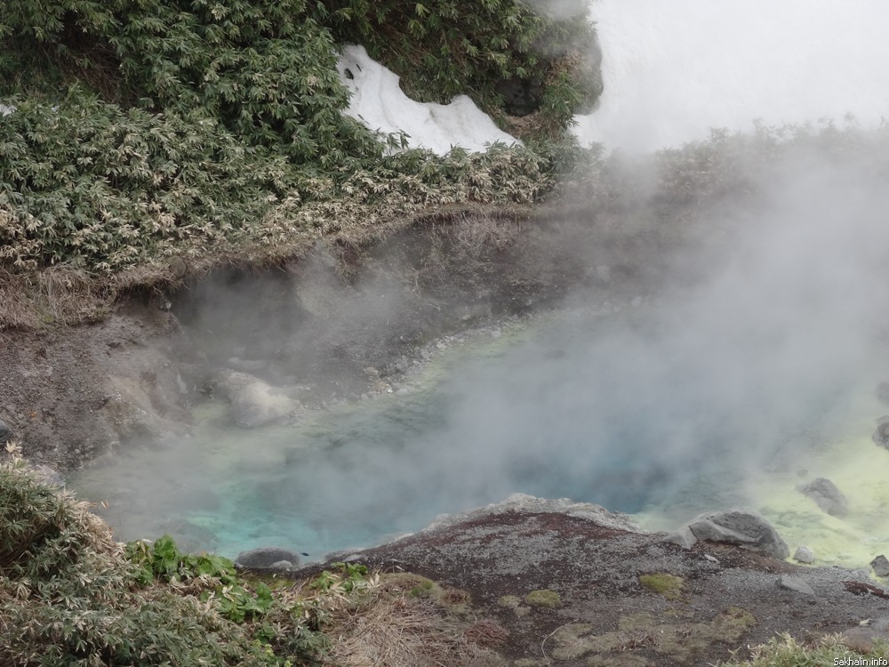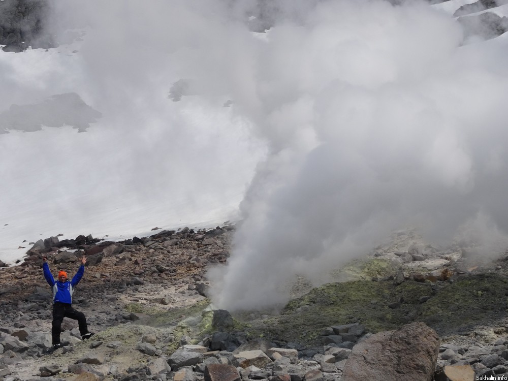 После купальни отправляемся в гости к "подземным кочегарам" — на фумарольное поле. На небольшом участке из-под земли в нескольких местах вырывается сероводородный пар. Звук напоминает шум моря или ровное шипение где-нибудь в цеху целлюлозно-бумажного завода, и снова этот специфический запах. Впрочем, он нисколько не портит общее впечатление от пейзажа, тем более вид на вулкан, укутанный в туманное манто, отсюда просто шикарный.