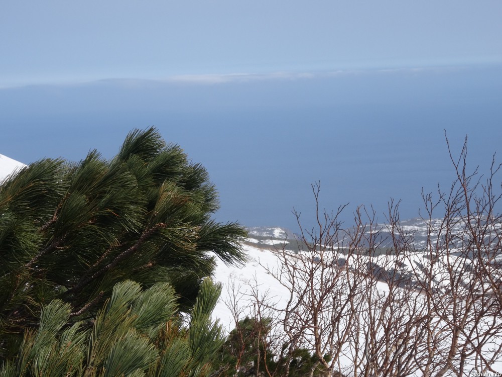 После катания решаем спуститься к океану. Это не так просто. Как к любой королевской персоне, к нему нужно пробиться через "охрану" — кедровый стланик. Он обманчиво кивает на ветру — да-да, проходите, а сам не пускает, обледенелыми зелеными лапами цепляется за одежду, ставит подножки хитросплетением стволов. В месте, где "охранников" чуть меньше, мужчины подпиливают торчащие ветки — проезд открыт. Совсем немного — и мы уже стоим у обрыва, и перед нами — самый большой на Земле дымчато-синий простор, пахнущий свободой, солью и морскими котиками.