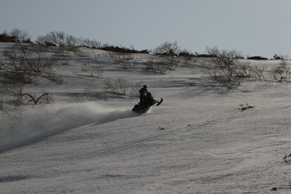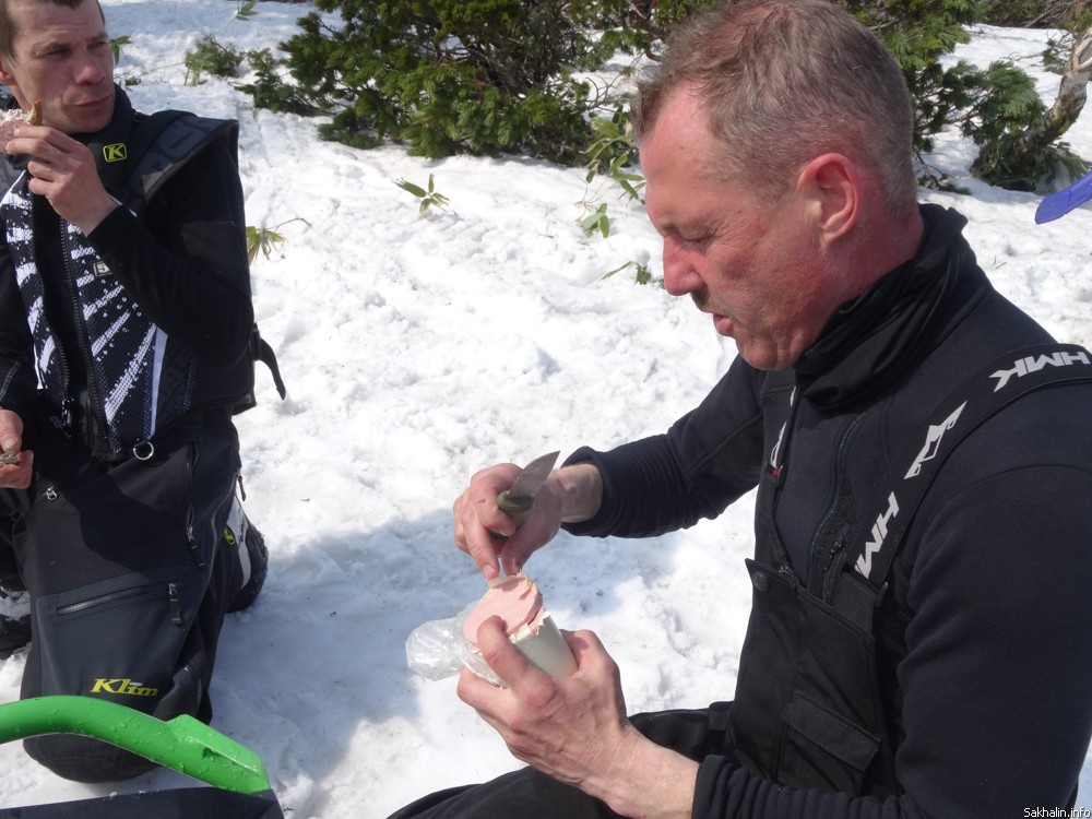 Перекус, разговоры на разные темы (эх, без политики и тут не обходится, никуда от нее не убежишь) и сборы в обратный путь. Но в Курильск мы отправимся не сразу, еще покатаемся. У ребят есть любимое место — длинный снежный бархан, на котором самое то соревноваться, кто выше подпрыгнет. Про эту часть путешествия рассказывать, наверное, излишне, лучше посмотреть фотографии Климова.