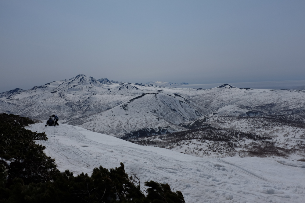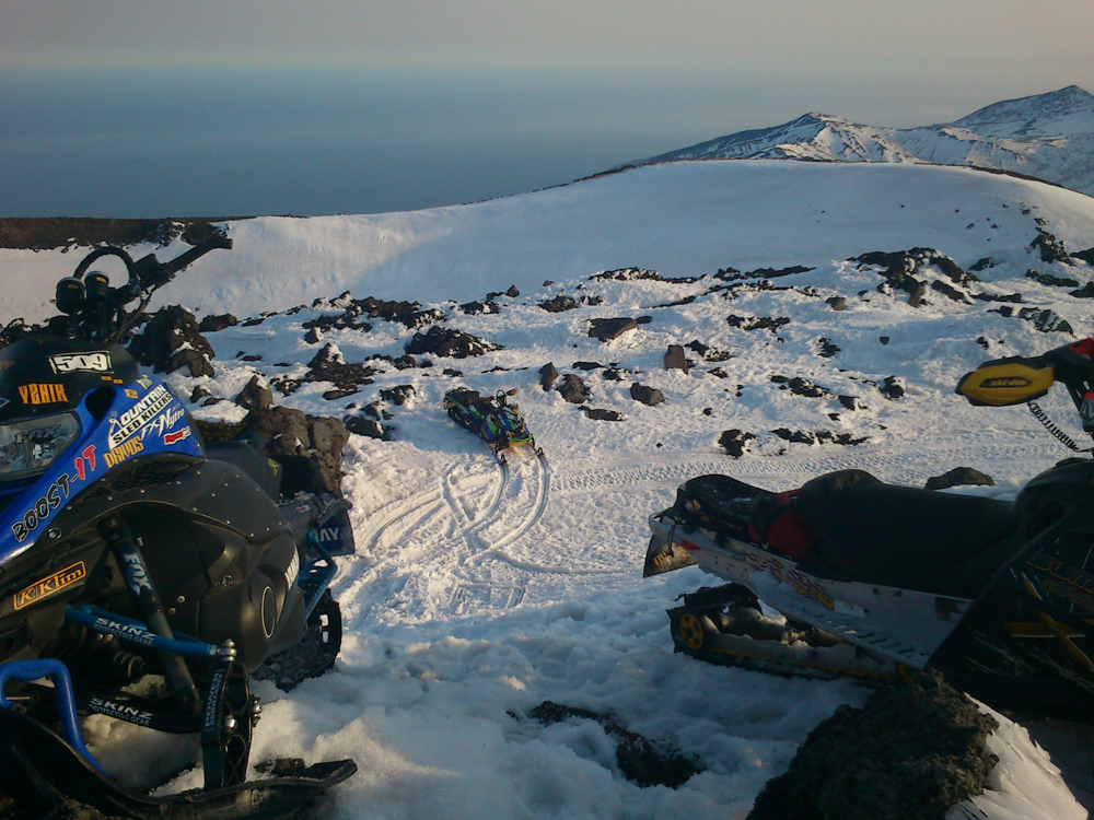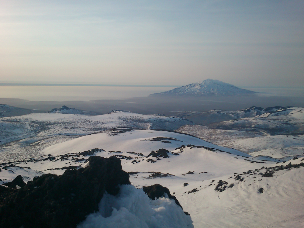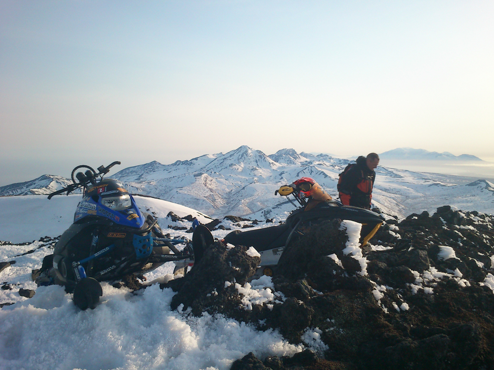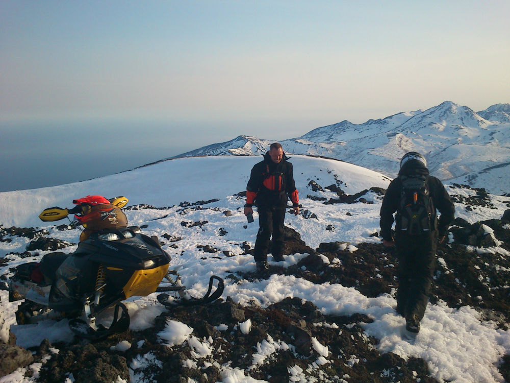 Наконец наступает самое интересное в нашем путешествии — подъем наверх. Конечно, не на самую вершину (высота Баранского — 1134 метра), но близко к ней. Погодка отличная, солнце пригревает, на утренний туман больше нет и намека. Несмотря на то, что окончательно хозяйничать здесь весна начнет еще не очень скоро, снег уже растерял свою зимнюю легкость — теперь он тяжелый, мокрый, из-под гусениц снегохода съезжает пластами. Иногда, совершая особенно мощный рывок вверх, машина встает на дыбы так сильно, что остается только вцепляться руками изо всех сил и зажмуриваться. Под нами — склон, где-то внизу зайцы машут нам лапами, желая удачно добраться, а впереди — вот он уже, пик. Еще несколько секунд — и мы потреплем вулканического зверя почти за самую холку.