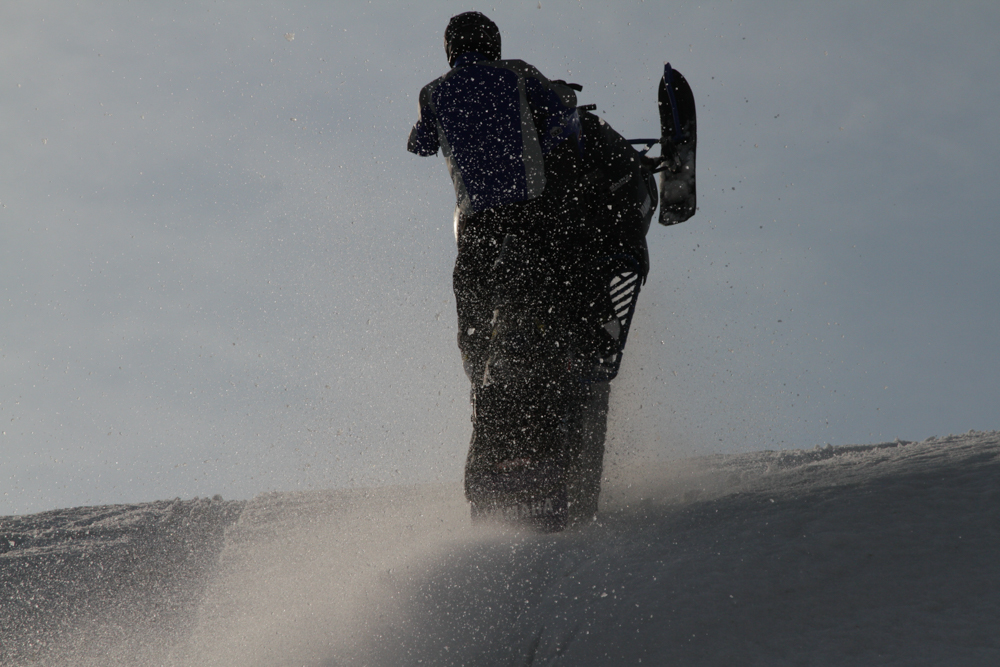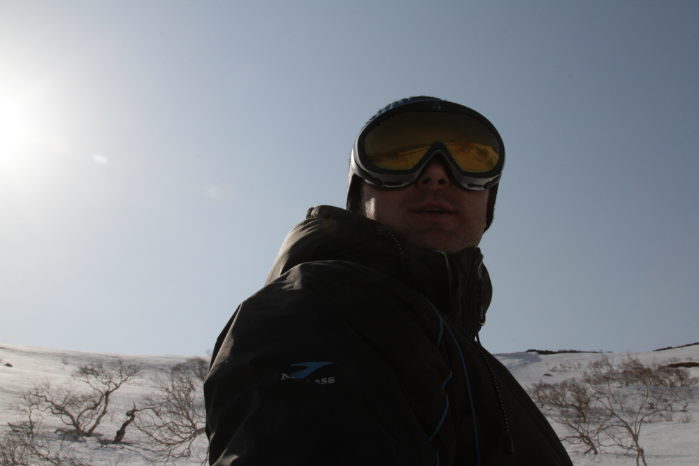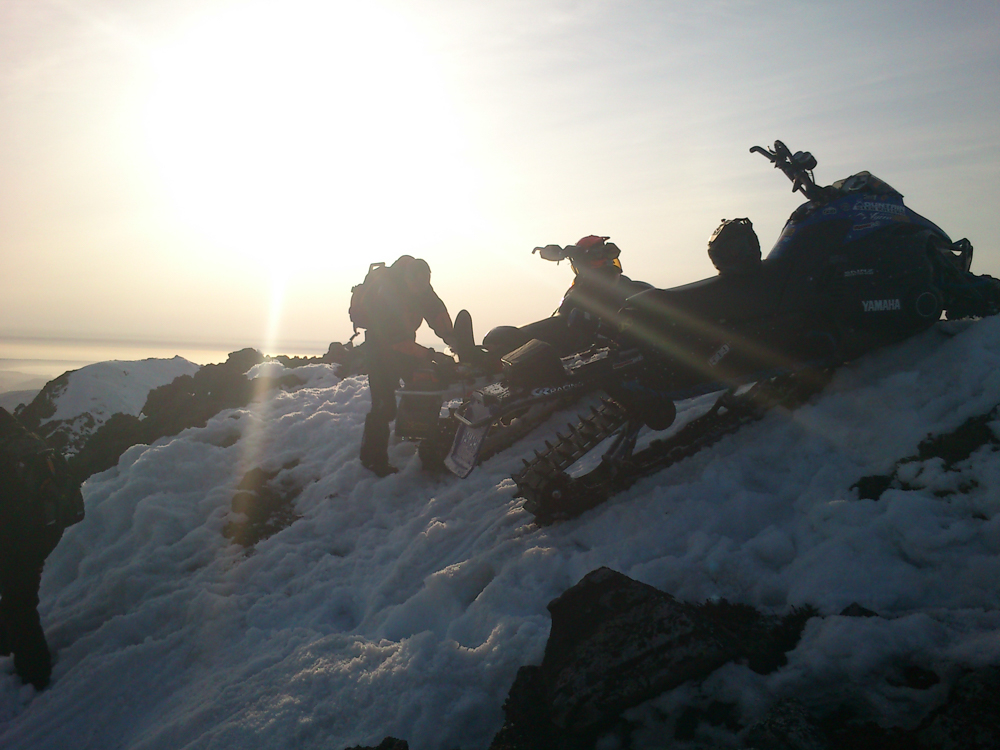 Наконец, после того, как склоны Баранского разлинованы вдоль и поперек, мы собираемся "на выход". По пути кто-то еще лихачит на прощание, и вот четыре снегохода съезжаются к одному месту, от которого мы с неохотой будем возвращаться обратно в цивилизацию. Стоп. Почему четыре? А где пятый?